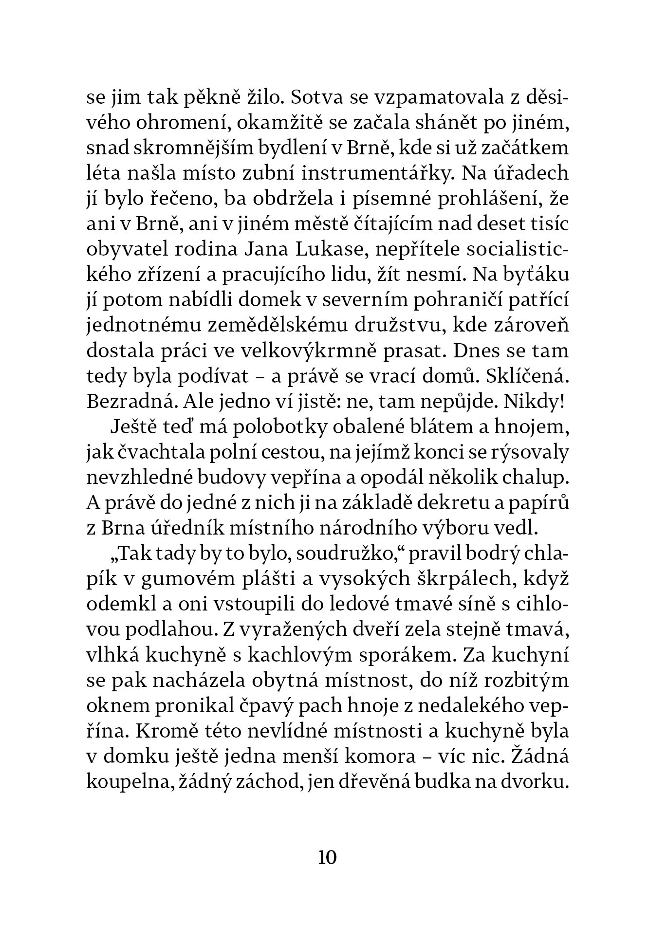 Zkušená autorka se v novém příběhu o rodině politického vězně vyrovnává částečně i s vlastní zkušeností. Klade si v ní otázku po možnostech „svobody na svobodě“ ve státem diktovaném životě. Umně využívá mnohost perspektiv, a to i za přispění spoluautorství svého manžela Jaroslava Nováka. Právě jeho kapitoly, inspirované farářem Ladislavem Simajchlem, který se skutečně „černých ovcí“ společnosti ujal, oslavují hrdinství v době, kdy scházelo. Hlavní hrdinkou je přesto Viktorie, již stesk po otci – básníkovi a „zrádci lidu“ – inspiruje k vlastní básnické tvorbě. Verše psané na slovácké dědině, kde je spousta práce, prodchne pocit samoty, hořkosti i smutku.