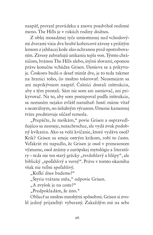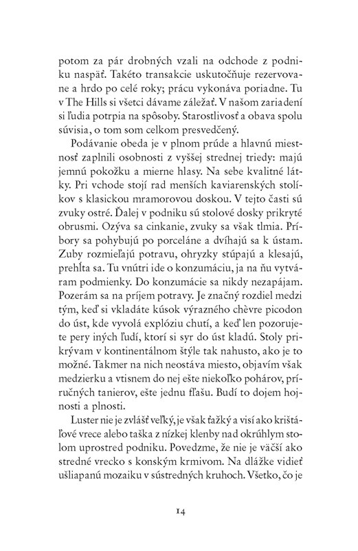 Dielo Reštaurácia The Hills je relatívne iba konverzačná komorná sociálna próza, ktorá viac ako na dej sa sústreďuje na popis vnímania sveta, ktorá sa snaží šperkovať predovšetkým naráciu a opis, ktorá nedáva otvorený význam a ktorá sa chce zamerať hlavne na interakcie postavy časníka s hosťami, na cudzie i jeho vlastné psychické či pocitové problémy (pretvarovanie, neúprimnosť, a filozofické zamyslenia nad životom, konzumom, strachom, spoloč. postavením ci správaním celej society), a ktorej nemožno uprieť potenciál, snahu autora či jeho talent a vrodenú schopnosť byť vtipným, no padá na veľmi neprehľadnej kompozícii či dejovej chaotickosti.
