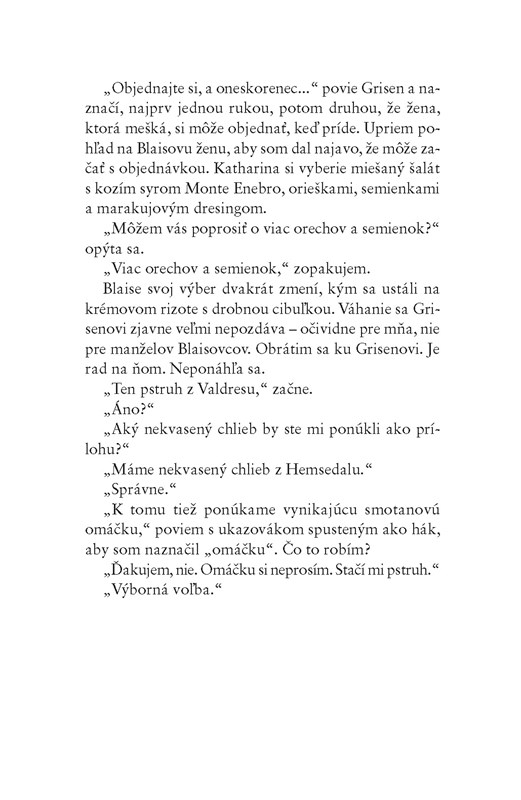 To samé o sebe vytvára veľmi slušný naratív, v ktorom sa v istom zmysle uplatňuje nespoľahlivý rozprávač, atmosféru budujú predovšetkým autorské monológy (keďže dialógov je celkovo určite pomenej) zamerané často i na psychologickú či filozofickú rovinu a reflexie, ale nielen to, i Faldbakkenova snaha o čo najautentickejšie zachytenie atmosféry reštaurácie, ktorá chtiac-nechtiac sa u autora stáva nielen miestom diania, ale samotnou živou postavou deja, zachytáva jej chod, prípravu pokrmov, či popisy hostí, ich výzoru, oblečenia atď., čo veľmi často komentuje, porovnáva či podobne. Popisy sú často veľmi expresívne, realistické, neidealizujúce, i s dôrazom na detail.