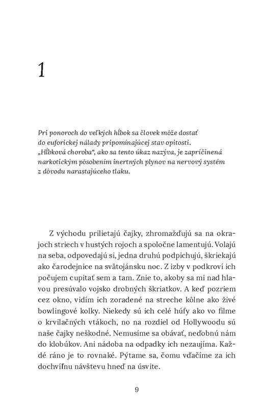 Tajomnú hĺbku však nemá len more, ale aj rodinné zväzky, o ktorých vie v malom mestečku najmenej vždy ten, koho sa najviac dotýkajú. A keď sa do tajomstiev svojho života ponoríte príliš prudko, môže nastať to, čo potápači nazývajú hĺbkovou chorobou. Úplný kolaps. Zatmenie.