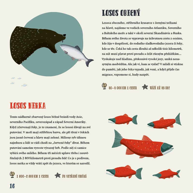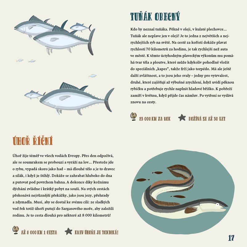 Některá zvířata se za celý život nepodívají dál než za humna, ale jiná procestují kontinenty… Třeba takový rybák dlouhoocasý, malý pták s červeným zobáčkem a nožičkami, každý rok obletí celou zeměkouli! Kareta obrovská si zase elegantně pluje přes moře a oceány, aby se podívala na místo, kde se kdysi narodila. Právě tam a nikde jinde naklade kulatá bílá vajíčka, z nichž se vylíhne spousta malinkých karet obrovských. Jen co želvičky vykouknou na svět, hned se rozutečou široko daleko. A víte vy vůbec, proč putují stáda afrických slonů nebo třeba sob? Že ne? Tak se pojďte rychle podívat! Ze stránek knihy na vás dýchne vůně exotických dálek. Součástí publikace jsou tři velkoformátové mapy, z nichž se čtenář dozví, po jakých trasách zvířata cestují a jaké vzdálenosti překonávají.