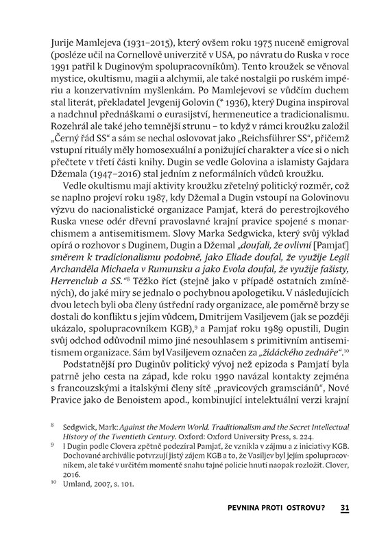 Co mají společného ruský postfašista, zapřisáhlý nepřítel západního světa a propagátor myšlenky Eurasie Alexandr Dugin a americký postanarchista a autor konceptu Dočasné autonomní zóny Hakim Bey (vlastním jménem Peter Lamborn Wilson)? Trojice autorů – politolog, básník a literární vědkyně – srovnávají dva na pohled velmi rozdílné myslitele a nacházejí v jejich pohledech na společnost a člověka i v jejich spirituálním základu vedle zásadních rozdílů i leccos společného. Oba dospívají k určité podobě radikalismu vlastní době po odeznění velkých sociálních utopií lidstva, zejména komunismu s jeho snem o beztřídní společnosti. Zatímco ruský autor hledá východisko v představách o mysticky pojímané eurasijské, „pevninské“ části světa, která je povolána porazit dekadentní a bezcharakterní „oceánský“ Západ, jeho americký protějšek hledá východisko v dočasném úniku do svobodného alternativního prostoru nepodléhajícího tlakům kapitalistického systému. Prostoru, který je svobodný právě a jen tehdy, když je časově omezený. Politologická část knihy z pera Ondřeje Slačálka zařazuje Duginovo myšlení do kontextu radikálně pravicových hnutí dneška a Beyovu koncepci do rámce vývoje anarchismu. Adam Borzič se ve svém oddíle věnuje mnohdy překvapujícím inspiracím, které oba autoři načerpali z mystické náboženské tradice. V závěrečné literárněvědné části se díky Olze Pavlově dostanou ke slovu natolik zajímaví autoři, jako je Rus Vladimir Sorokin (Den opričníka) či Američan Chuck Palahniuk (Klub rváčů).
