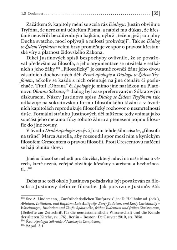 Ako som už vyššie písala, čítanie tejto knihy nenudí. Ponúka zaujímavú recepciu kresťanskej literatúry v 2. storočí, na ktorú hľadí s vedeckým zameraním rovnako ako aj s túžbou po poznaní osobnosti Justína, jej autora. Text je písaný jasne a poporiadku, ktorý si nastolila autorka. Ponúka najprv teoretické poznatky a následne ukazuje ich pretavenie v samotnej pôvodnej práci. Čitateľ tak hľadí na prácu, ktorá zohľadňuje lexikálne, gramatické, ako aj etymologické bádanie v starom texte. Svoj prínos ponúka na poli náboženskom, literárnom i historickom. Publikácia môže zaujať každého, kto sa zaujíma o ranokresťanskú literatúru, prácu s pôvodnými textami či analýzu a interpretáciu menej známych diel.