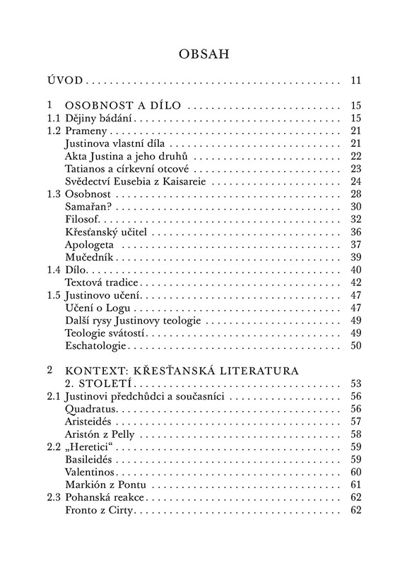 Autorka svoju knihu rozdelila na niekoľko kapitol a viacero podkapitol. Najprv poukázala aspoň na malé množstvo informácií o samotnom živote Justína. Čitateľa zaviedla aj do užšieho kontextu kresťanskej literatúry v 2. storočí, odôvodnila činnosť apolegétov a poukázala na niekoľko mien, s ktorých nositeľmi sa viedli spory. Najdôležitejšou a nosnou časťou knihy bola jej samotná interpretácia tvorby Justína.