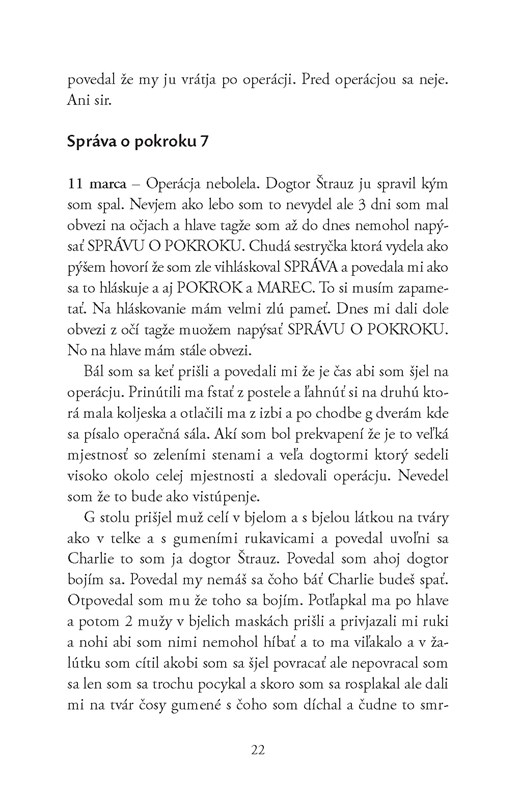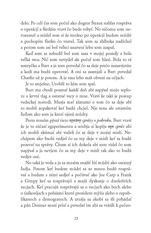 - narácia : text je pomerne veľmi ľahko čitateľný ( a v konečnom dôsledku i interpretačný) i pre bežného zážitkového čitateľa - nakoľko autor volí skoro bežný, hovorový štýl jazyka v priamom rozprávačovi, čo podmieňuje z veľkej časti i inteligenčná úroveň Charlieho, veľa motívov opakuje, znova analyzuje a ,,rozoberá na drobné", častá je retrospektíva, čo slúži pre lepšie pochopenie minulosti postavy, zamýšlanie sa nad už vyslovenými myšlienkami atď., čím sa román, i keď s označením ,,sci-fi" stáva prístupnejším i pre nemilovníkov žánru, psychologická rovina dokonca zväčša prevažuje. Zaujímavým prvok je potom pravopisná/ortografická stránka diela - v častiach s nízkym intelektom sa vyskytuje doslova detská štylistika viet a veľmi chabý, až fonetický pravopis, ktorý sa vzrastajúcim intelektom priamoúmerne mení na kvetnaté, poetické vety na úrovni vzdelanca, na úrovni skoro 200 IQ až génia, pričom i reflexie a introspekcie nadobúdajú nový, geniálny charakter.