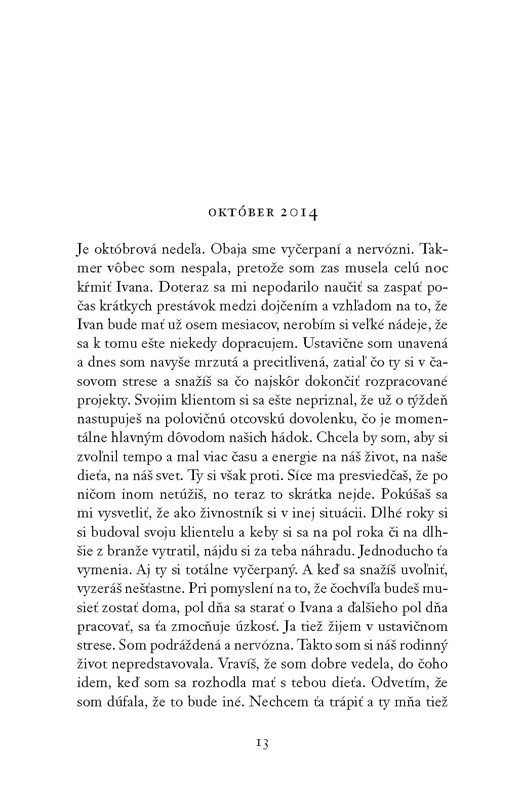 V tejto knihe teda nájdete akoby dlhší monológ s mŕtvym, v ktorom Carolina opisuje vzťahy medzi kamarátkami, rodinou, strach o dieťa, o seba, začlenenie sa do spoločnosti, materstvo, opisuje dôveru, lásku, hľadanie šťastie pre seba a svojho syna, vyrovnávanie sa so svojím životným údelom, opisuje starostlivosť o dieťa, zmenu prostredia, čo musela a nemohla urobiť, čo jej dodalo silu a čo ju o ňu obralo.