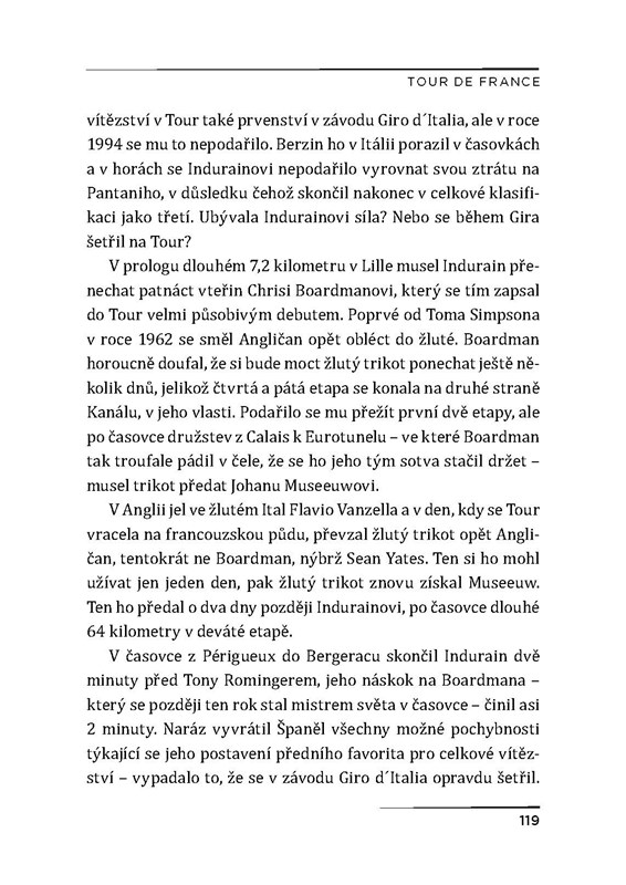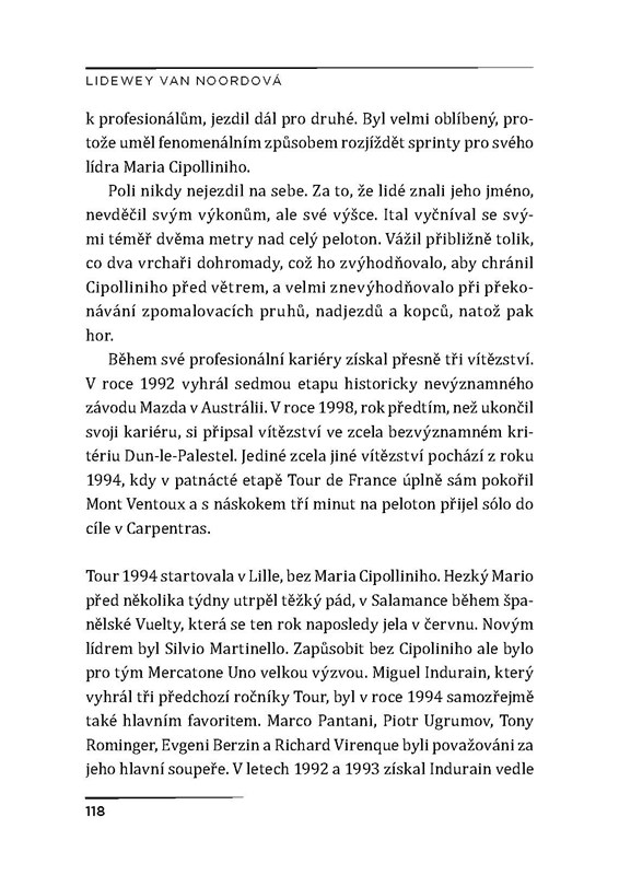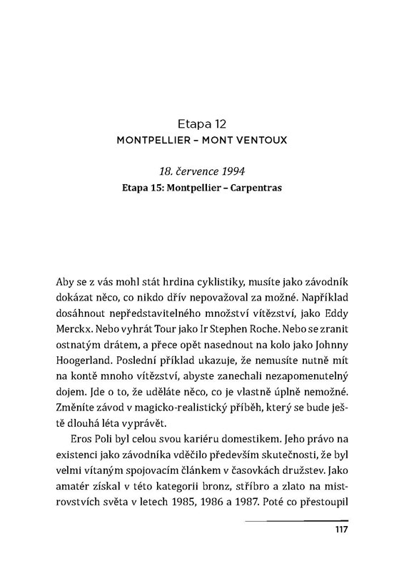 Hrdinství, pády, rychlost, sebezapření, doping, kopce, cílové rovinky, úžasná krajina, skvělá atmosféra a jedno neuvěřitelné dobrodružství – to je Tour de France. Sportovní redaktorka Lidewey van Noordová sleduje trasu závodu a v jednadvaceti kapitolách vypráví o cyklistické historii míst, kterými slavná Grand Tour projíždí. Svým strhujícím stylem a smyslem pro důležitý detail nizozemská novinářka dokazuje, že psaní o cyklistice nemusí být jen mužskou záležitostí.