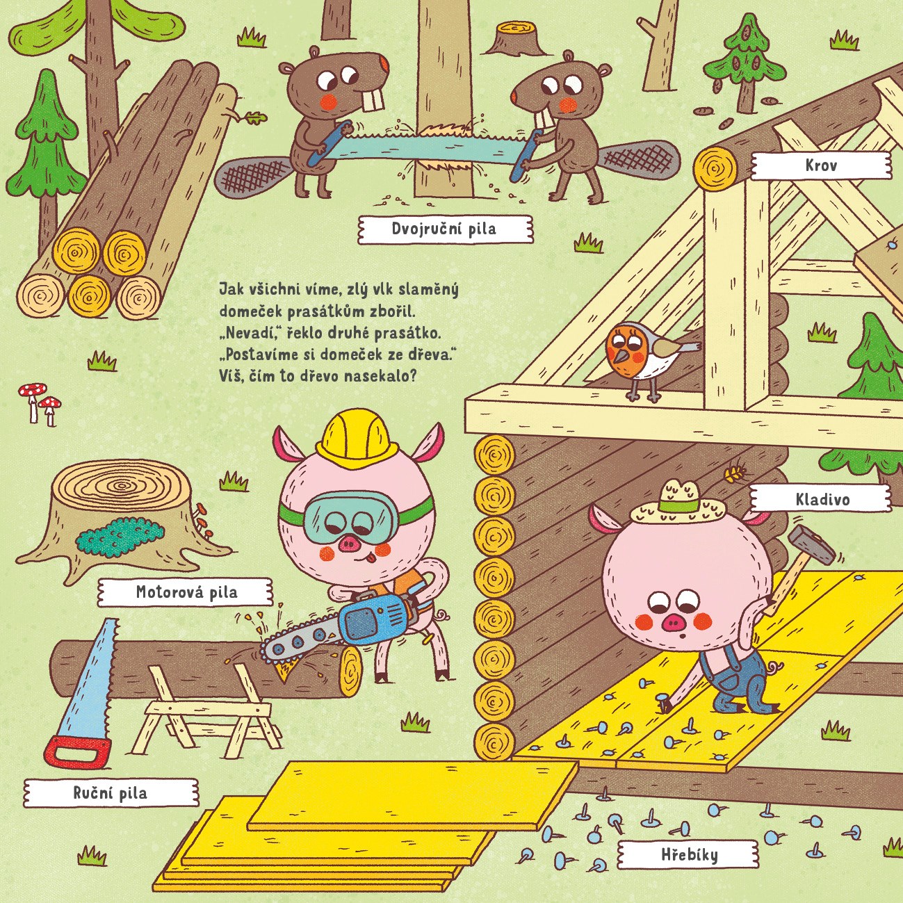 Tři prasátka si chtěla postavit domeček. Ale jak se vlastně takový domeček staví? Oblékni si montérky a podívej se, co všechno prasátka potřebovala: jeřáb, bagr, krumpáč, nákladní auto, cihly, zednickou lžíci… Kdo jim pomáhal a jakou zvláštní věc našla prasátka hluboko v půdě? To se dozvíš v této knížce.
