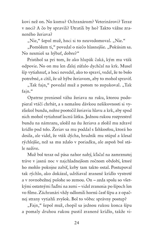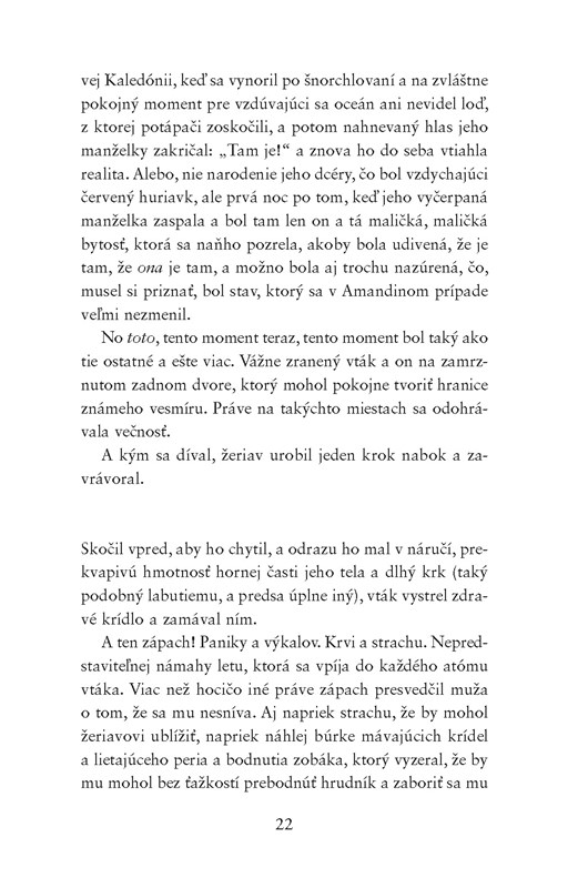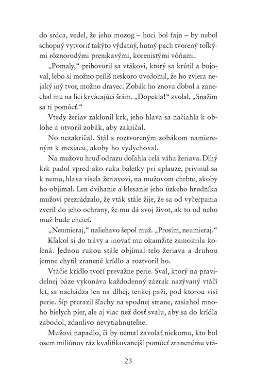Predstavte si praobyčajného štyridsiatnika, Američana žijúceho v Londýne, vlastní obchod s tlačiarenskými službami, je rozvedený, jeho dcéra si nechce priznať, že je depresívna a on si nechce zasa priznať, že je osamelý a uviaznutý v nudnom stereotype - je to ten najobyčajnejší človek na svete, ktorý by rád znovu žil vo vášni a eláne, len nevie ako na to. Toto všetko, aj mnohé ďalšie, je George Duncan, hlavný hrdina Nessovho dospeláckeho magicko-realistického románu, ktorý pojednáva o jeho živote po tom, čo znenazdajky v jednu noc zachráni vo svojej záhrade žeriava. No a na druhý deň sa až podivuhodne jednoducho spozná s očarujúcou Kumiko, ktorá má srdce zo zlata a čistú dušu. No hoci je Kumiko milá a nedokázala by ublížiť ani muške - niečo o sebe tají a nerada rozpráva o sebe či svojej minulosti.