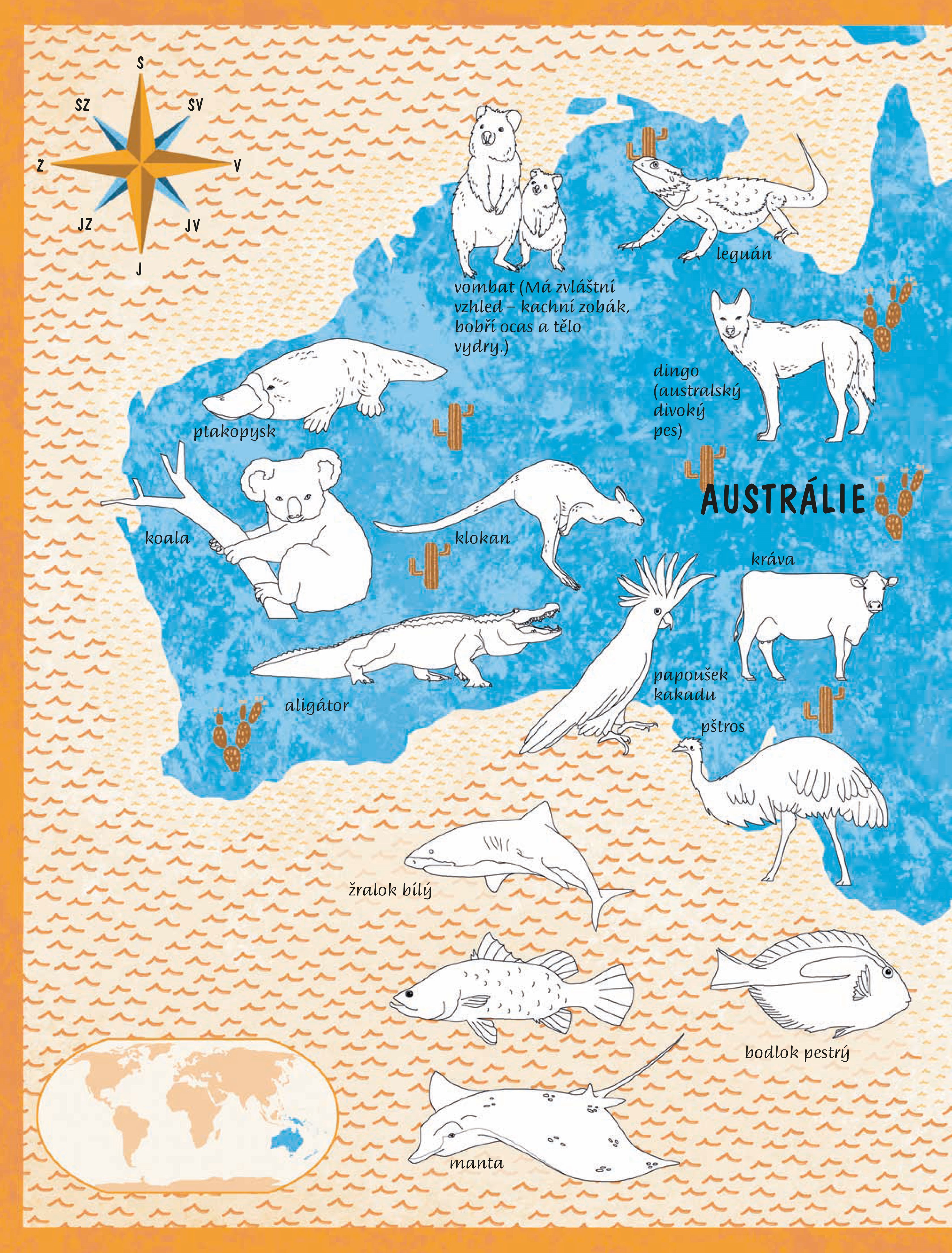 Seznamte se s mapami jednotlivých kontinentů, které si vybarvěte podle libosti. Na stránkách, které se věnují jednotlivým kontinentům, narazíte na známá i méně známá zvířata a rostliny.