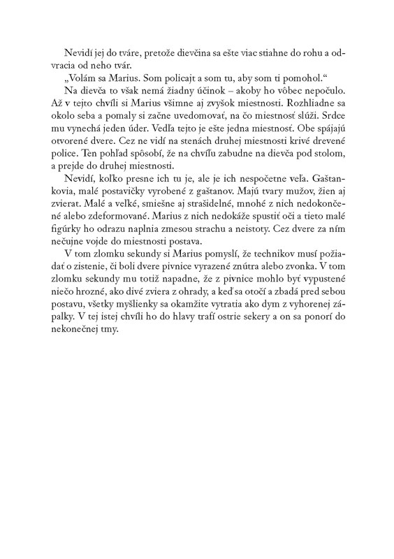 Samozrejme, vzhľadom na veľké množstvo škandinávskych trilerov sa niektoré postupy pretransformovali na ustálené klišé, ale našťastie stále dokážu pobaviť a zaujať. Nadšenci žánri budú určite spokojní, nováčikovia v tomto smere zase spoznajú to najlepšie, čo sever ponúka. Gaštanko robí česť svojim starším knižným súrodencom a buduje si vlastné meno. Mark Hess je klasický ostrieľaný detektív, potýkajúci sa s pracovnými i osobnými problémami. Tu mi však nedá nepristaviť sa. Hess sa do Kodane dostáva z Europolu, kde sa dopustil akýchsi prešľapov, a preto sa ho zbavili, kým sa nadriadení nerozhodnú, čo s ním. Lenže čitateľ sa sotva dozvie, o čo išlo, dokonca aj jeho osobná tragédia je odbavená jednou vetou, navyše z druhej ruky vďaka náhodnému rozhovoru Thulinovej s inou postavou. A keď sme pri Thulinovej, ani jej osobný život nám veľa neponúkne. Nevravím, že je to škoda, niekedy rodinné súvislosti iba spomaľujú dej a samotné riešenie prípadu, no tu sa mi, napríklad, žiadalo vedieť viac. Ktovie, či išlo o Sveistrupov zámer trochu naštrbiť zaužívané autorské metódy, alebo si predsa len ešte necháva otvorené možnosti pre ďalšie potenciálne pokračovanie. Čo sa mi ale páčilo, bol vzťah Hessa a Thulinovej, ktorý sa nedá označiť práve za bezproblémový. Už od začiatku si nesadli, ale boli nútení spolupracovať, pričom sa prejavila ich vysoká profesionalita. A veru jej bolo treba, pretože vrah s prezývkou Gaštanko je naozaj nezvyčajný. Ženské obete pripravuje časti nôh a rúk, akoby si vytváral vlastnú figúrku namiesto tých z gaštanov, aké necháva pri naaranžovaných telách. Navyše s odtlačkami dcérsky dánskej ministerky, ktorú uniesli už pred rokom a jej prípad je považovaný za uzavretý. Je možné, že by predsa len mohla byť ešte nažive? Alebo sa len niekto zahráva s političkou, ktorá sa po čase vrátila do svojej funkcie?