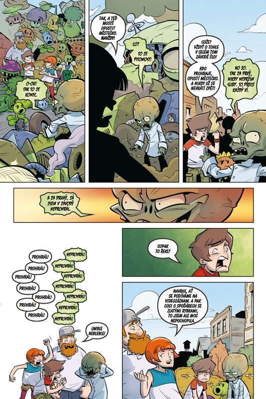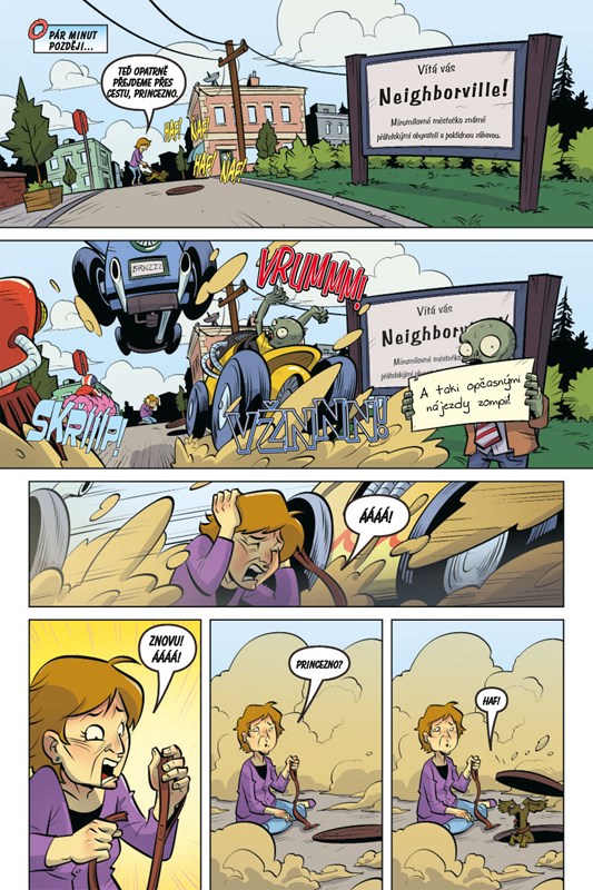 „Dr. Zomboss a jeho skvjelé zompie za volanty pošlapaných zvoz vzod aut proti lsitvím lidem. A hlavně tomu s kastrólem na hlavě. A prordraným rostlinám. Jakobi mněli šanci. Zombie to číst nemusí, mi víme, jak to dopadne. Jsme lepčí řidiči. A je nás víc. Mnohem víc! Jen si to přčtěte, uvidíte, jak jsou Zombossovi závodníci skvjelí.“