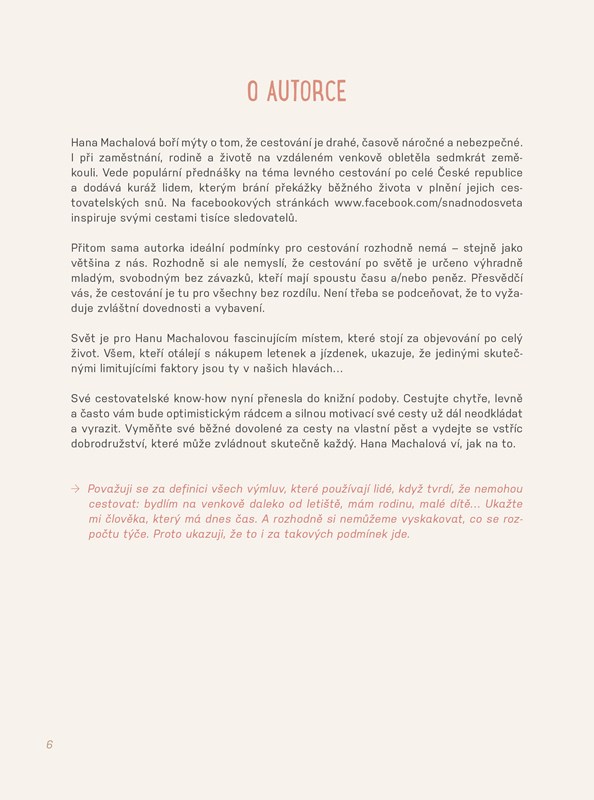 Svět je pro Hanu Machalovou fascinujícím místem, které stojí za objevování po celý život. Všem, kteří otálejí s nákupem letenek a jízdenek, ukazuje, že jedinými skutečnými limitujícími faktory jsou ty v našich hlavách…