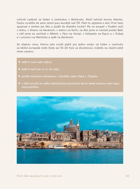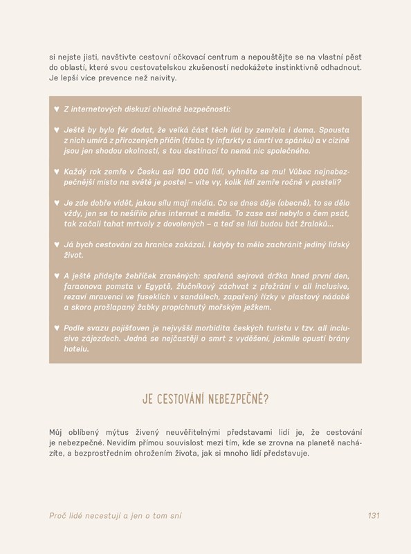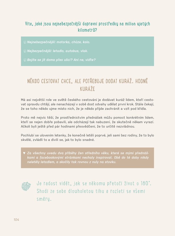 Přitom sama autorka ideální podmínky pro cestování rozhodně nemá – stejně jako většina z nás. Rozhodně si ale nemyslí, že cestování po světě je určeno výhradně mladým, svobodným bez závazků, kteří mají spoustu času a/nebo peněz. Přesvědčí vás, že cestování je tu pro všechny bez rozdílu. Není třeba se podceňovat, že to vyžaduje zvláštní dovednosti a vybavení.