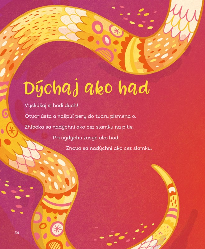 Vyskúšajte spolu s deťmi jednoduché cvičenia z tejto knihy zamerané na podporu správneho dýchania, ktoré upokojuje myseľ, uvoľní telo a rozprúdi v ňom pozitívnu energiu. Pomocou príbehov o zvieratkách sa deti naučia sústrediť a upokojiť. Môžu sa natiahnuť ako mačiatko alebo dýchať ako spiaci medvedík, stať sa na chvíľu stromom a sledovať, ako ich dych pomaly prestupuje celým telom.