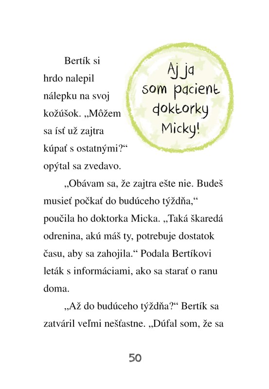 V Bodliakove majú nové kúpalisko a zvieratká sa už nevedia dočkať, kedy si zaplávajú. Doktorka Micka a sestrička Piškótka však musia ešte vydržať, lebo ich pomoc potrebuje zranené šteniatko. Aj Bertík je z toho celý nešťastný, no pani doktorka ho hneď ošetrí, a tak si bude môcť máčať labky vo vode, ani sa nenazdá.