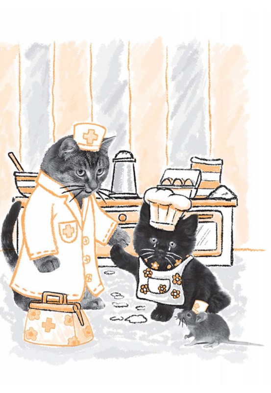 Pomóóc! Mačiatko Grétka má problém. Bolí ho papuľka. Musí na chvíľu prerušiť pečenie mafinov. Doktorka Micka so sestričkou Piškótkou však našťastie rýchlo a s rozvahou rozlúštia záhadu Grétkinej bolesti a vrátia jej úsmev na chlpatú tváričku.