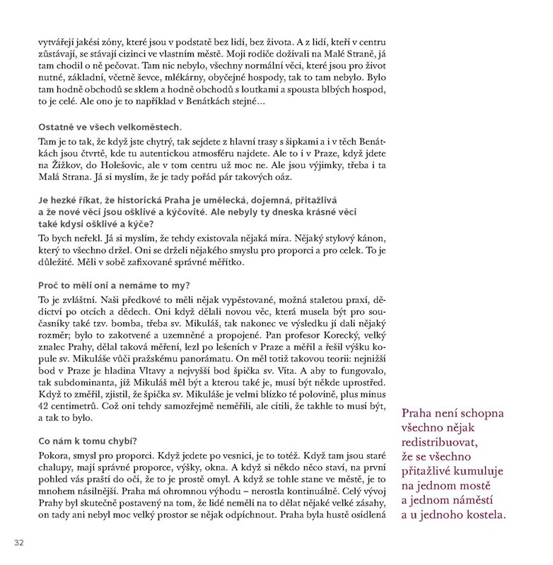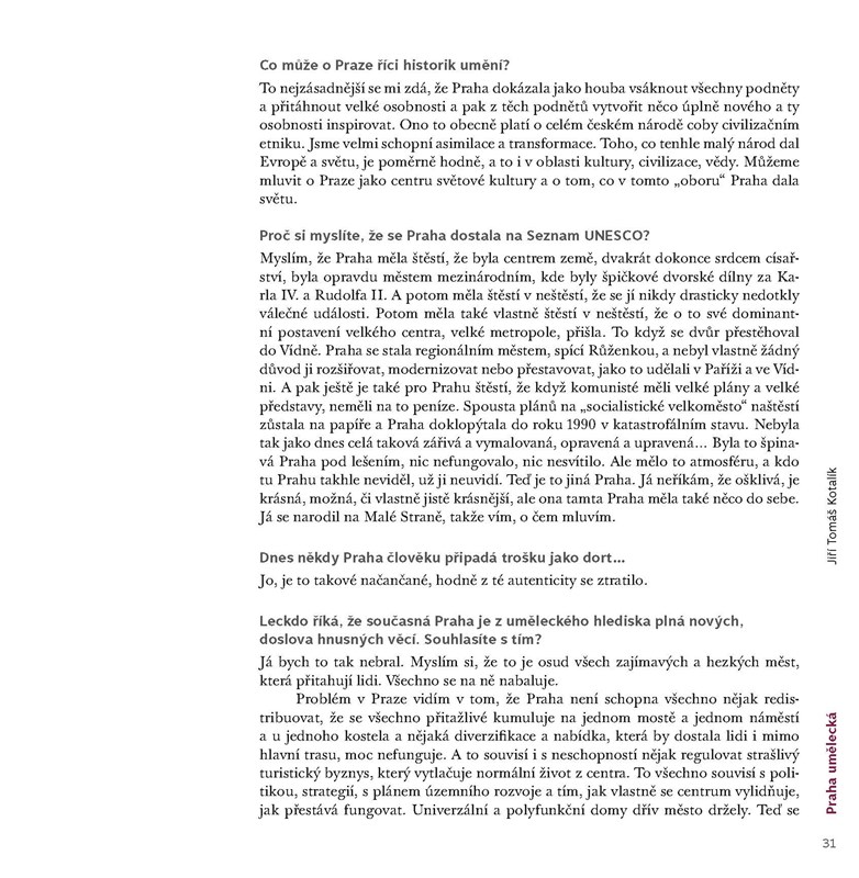 Tato kniha, ač plná fotografií, je uprostřed mnoha publikací o metropoli ojedinělá. Představuje rozhovory s vynikajícími odborníky, kteří z hlediska svých profesí město hodnotí a upozorňují i na nebezpečí, která mu hrozí. Zajímavé otázky o Praze za čtenáře kladli dva tazatelé, Karel Kučera a Vladimír Kučera Můžete si tak popovídat o Praze historické s Václavem Ledvinkou, o Praze umělecké s Jiřím T. Kotalíkem, o Praze archeologické s Jaroslavem Podliskou, o Praze předlistopadové s Pavlem Jeriem, o Praze zapsané na seznam UNESCO s Michalem Benešem, o Praze urbanistické s Janem Sedlákem, o Praze turistické s Františkem Kadlecem, o Praze moderní s Martinou F. Koukalovou a o Praze přírodní s Jiřím Sádlem.. Je určena všem návštěvníkům Prahy, kteří ji chtějí poznat, ale upozorňuje i na drobné a unikátní detaily, které by měli znát a obdivovat i sami Pražané. V době, kdy Výbor světového dědictví UNESCO ohlásil možné vyškrtnutí Prahy ze svého seznamu, chce také nakladatelství Vyšehrad vzbudit zájem o udržení historického odkazu Prahy a upozornit na její krásu. Praha přece patří mezi perly světového dědictví!