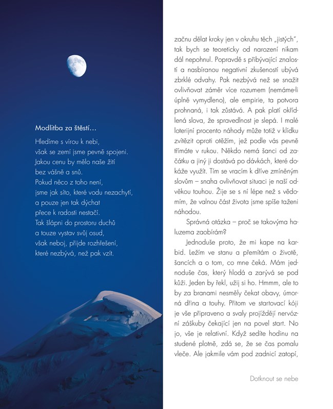 Pokračoval jsem výpravou do centrálního nepálského Himálaje na do té doby nelezenou stěnu. Z dálky připomínala tesák, trhající mraky vedví. Bylo jasné, že musela být má. Závěrečný běh patřil Nahé hoře – či hoře Zabiják –, jak ji bohužel lidé nelichotivě nazvali. Ano, odehrály se tam desítky tragédií s hořkým koncem. Věřte však, že na vině není přírodní div Naga Parbat s největší stěnou světa. To lidská touha, mnohdy hloupost a někdy jen špatný okamžik se podepsaly na konečném skóre. Přesto osmitisícový diamant západního Himálaje dál v poklidu kraluje svému okolí, láká a ohromuje zároveň.