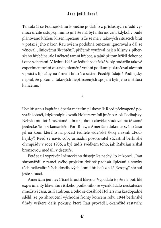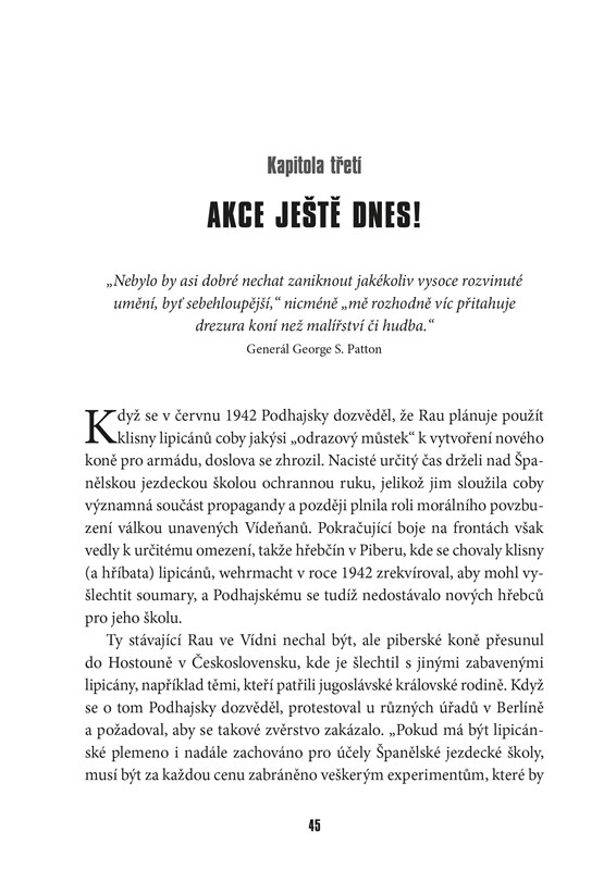 V okamžiku, kdy Rudá armáda utahuje smyčku kolem zbytků třetí říše, odesílá německý plukovník zprávu důstojníkovi americké vojenské zpravodajské služby – píše se v ní o neobvyklém zajateckém táboře, který má být brzy obsazen Sověty. Jenže na onom místě ležícím kdesi v jihozápadních Čechách nejsou jen zajatci. Nachází se zde také více než tisíc koní, a to včetně celého stáda vzácných bílých lipicánů z vídeňské Španělské jezdecké školy a těch nejlepších arabských plnokrevníků. Byli ukradeni nacisty s cílem vytvořit „panskou koňskou rasu“. Koňům, jejichž cena je nevyčíslitelná, hrozí, že pokud stáje obsadí jako první Rudá armáda, budou zabiti a poslouží jako potrava. Američané, vedení známým milovníkem koní generálem Pattonem, se rozhodnou pro riskantní krok – pomoci německým chovatelům zachránit tato majestátní zvířata.