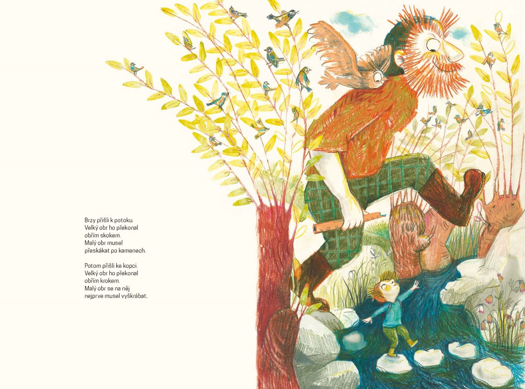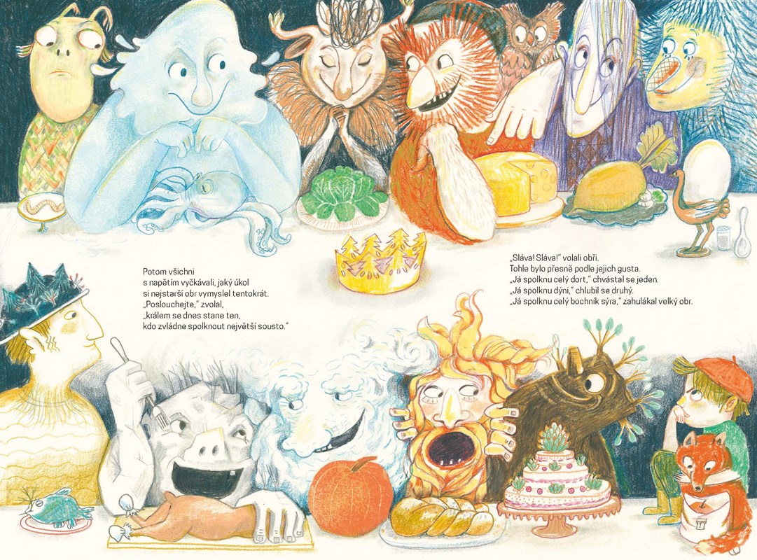 V zemi obrů žijí spolu velký a malý obr. Když jim sova doručí pozvánku na slavnost, velký se hned chystá na cestu. A malý nedá jinak, než že půjde s ním. Musí překonávat náročné překážky, ale díky své chytrosti se nakonec stane králem obrů. Dokáže totiž sníst největší sousto. Jak to dokáže, když je tak maličký? Odpověď se ukrývá v této obrázkové knížce, díky níž děti zjistí, že skutečně velký není ten, kdo je nejsilnější a nejhroznější.