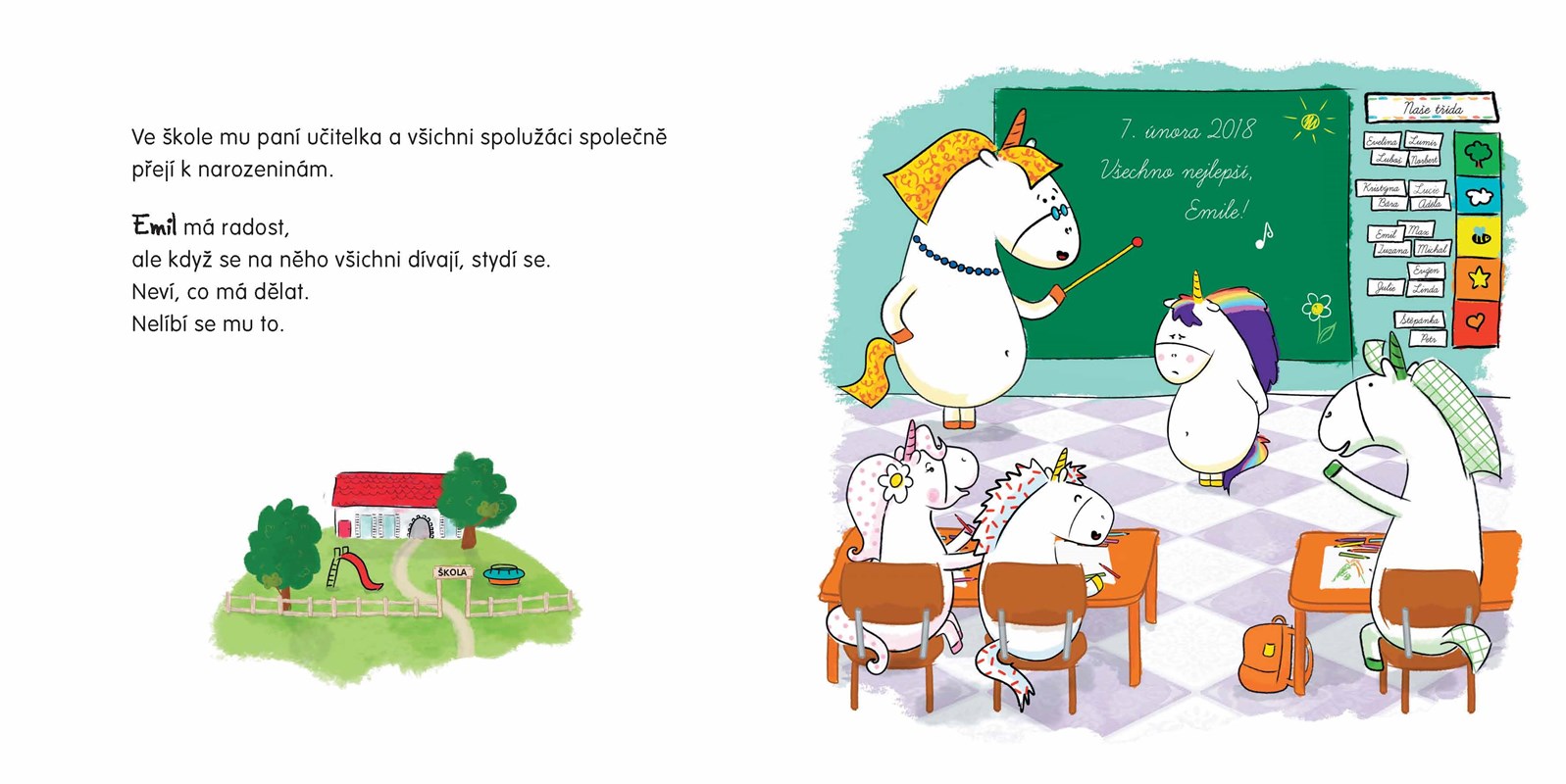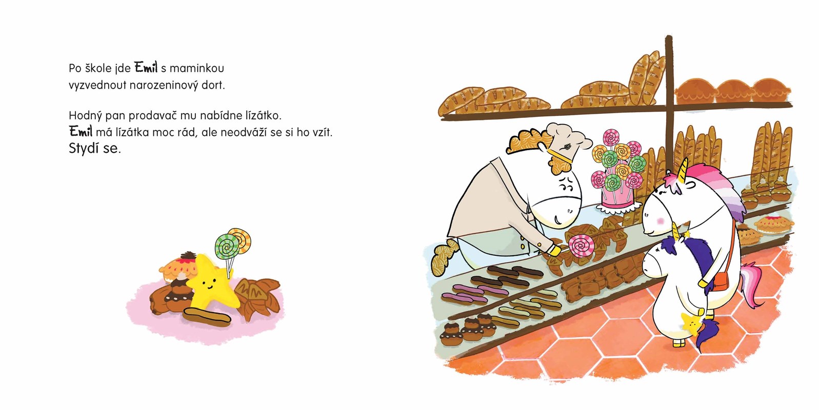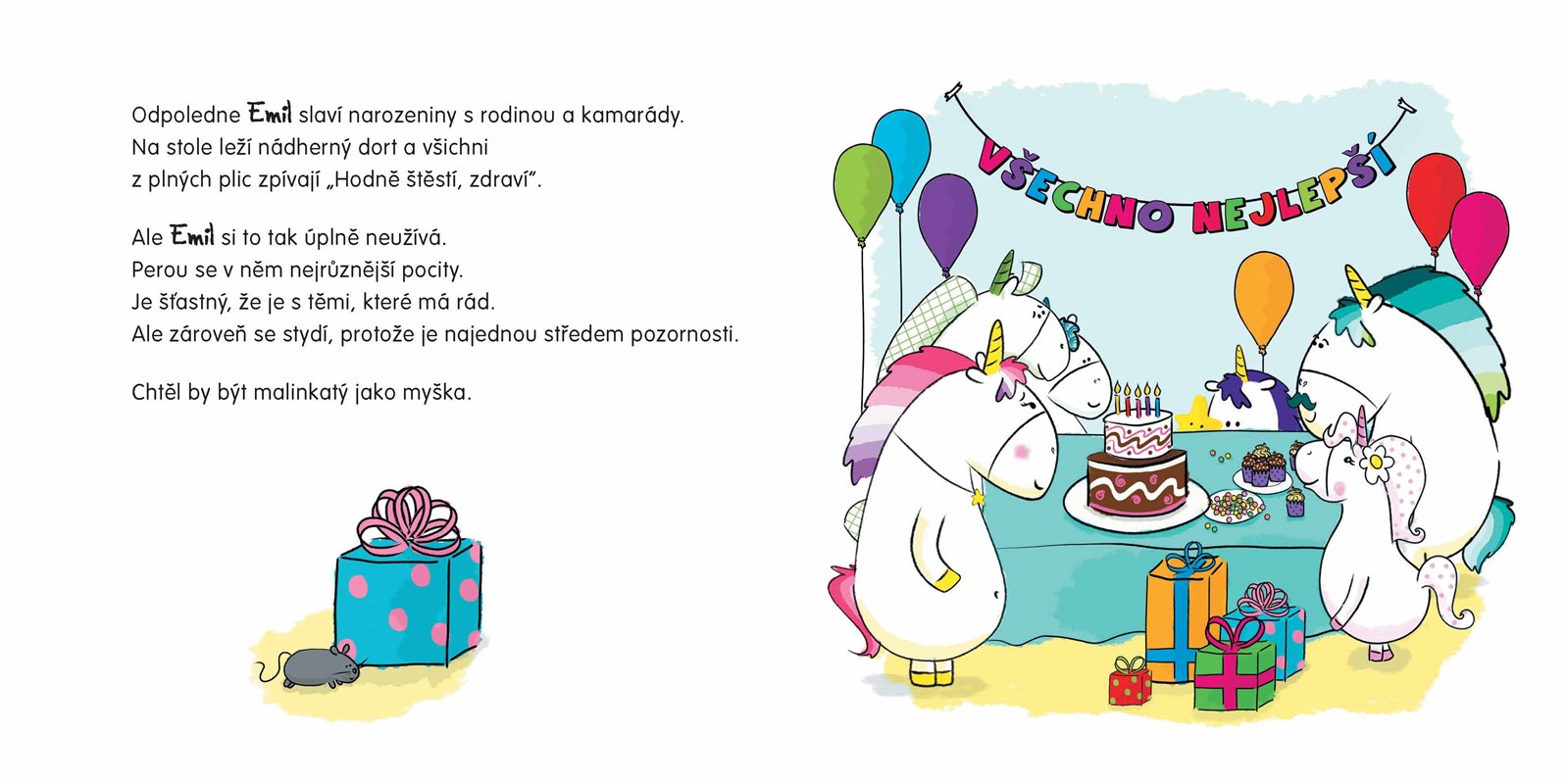 Emil je malý jednorožec jako každý jiný, tedy skoro… Jeho duhová hříva mění barvy podle toho, jak se zrovna cítí. Dneska se Emil stydí, protože má narozeniny, je středem pozornosti a neví, jak na tolik pozornosti reagovat. Zjistěte, jak se Emilovi podaří stud překonat!