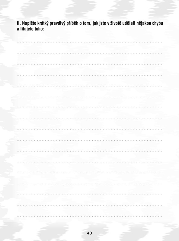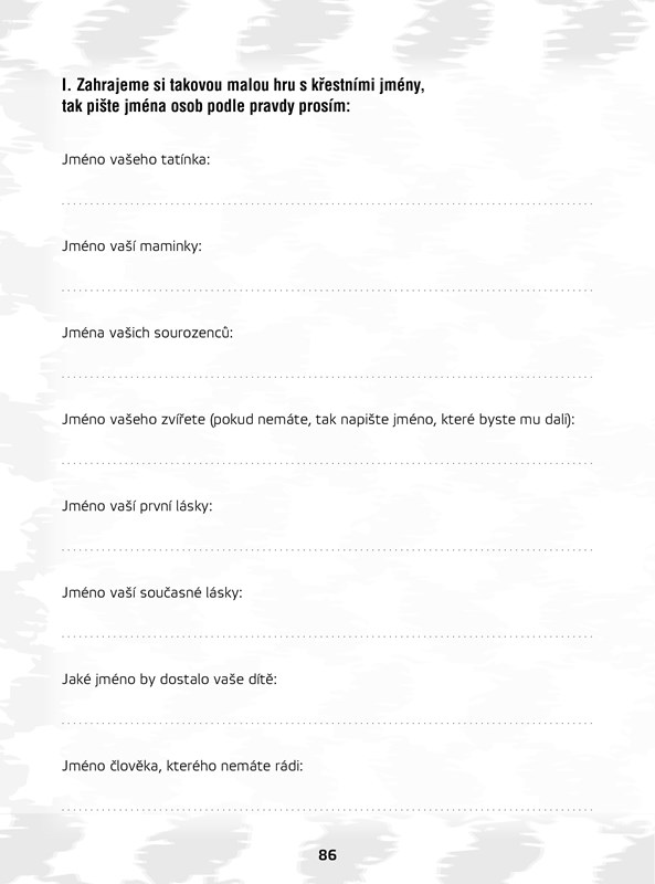 Málokdo si přečte u knihy i tuto zadní stranu až do konce, a tak tu mám pro každého, kdo dočetl až sem, jeden tajný úkol navíc. Ustřihněte spodní roh zadní strany knihy a dejte ho člověku, který tuto knihu má také. Pokud si vás váží, i on ustřihne stejný roh knihy a dá vám ho zpět. Tento roh poté přilepte nazpět ke knize, kam patří.