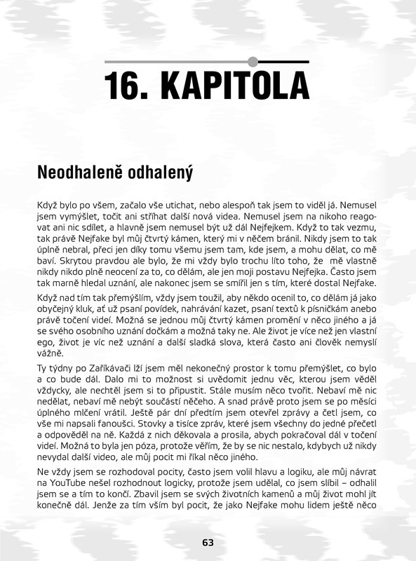 Už 10 let vystupuji na internetu jako Nejfake, ale můj příběh nebyl nikdy kompletní. Teprve až nyní můžete díky této knize získat poslední část mozaiky a pochopit, kým Nejfake doopravdy je. Mohl jsem o tom natočit video, mohl jsem napsat status na sociální síť, mohl jsem nahrát fotku na Instagram bez šátku… Ale já se rozhodl pro knihu. Knihu, která je tak trochu jiná než ostatní. Nejen že poznáte můj příběh, ale ten obyčejný papír můžete díky svojí představivosti přeměnit v něco jedinečného.