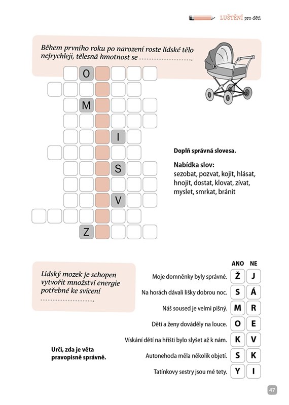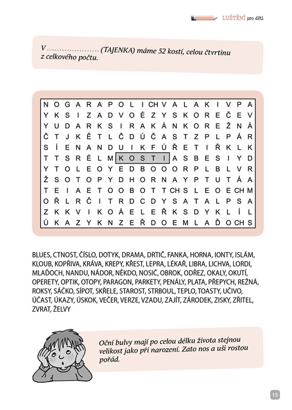 Křížovky, osmisměrky, sudoku či spojovačky a k tomu navíc spousta zajímavostí o lidském těle. Víš, která kost je v lidském těle nejdelší nebo kolik svalů se zapojuje při chůzi? Tušíš, jak velký je lidský mozek a jakou barvu očí mají čerstvě narozená miminka? Pokud ne, je čas se to dozvědět. Roztoč mozkové závity a pusť se do toho!