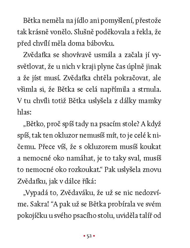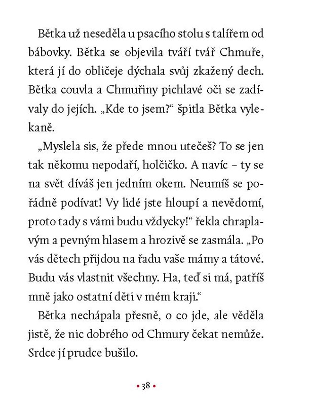 Bětka je desetiletá holčička. Chodí do školy, má svoje běžné dětské starosti. A některé méně běžné. Trápí ji, že se jí děti často smějí nejen kvůli brýlím, které nosí, ale hlavně kvůli okluzoru. A to pořád není nic proti tomu, když zjistí, že se maminka a tatínek budou rozvádět. To je na Bětku prostě nějak moc. A tak na ni sedne Chmura. Čarodějnice Chmura. A Bětka musí hodně bojovat, aby ji přemohla… Vždycky, když usne, přejde Bětka do kraje, v němž vládne Chmura. Ta vězní na svém hradě mnoho smutných dětí. A tak Bětka musí bojovat nejen za sebe, ale i za ně…
