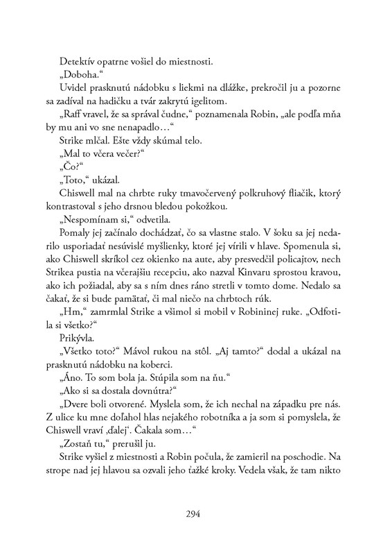 Vyšetrovanie zavedie Strikea a jeho spoločníčku v detektívnej agentúre Robin Ellacottovú z ošumelých ulíc Londýna do zákulisia Parlamentu a privedie ich nielen na stopu závažného zločinu, ale aj nemorálnych skutkov nedotknuteľných, ktoré nikdy nikto netrestal. Zamotáva sa nielen tento prípad, ale aj osobný vzťah Strikea a jeho neoceniteľnej pomocníčky v práci Robin Ellacottovej...