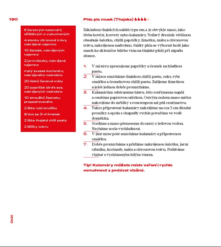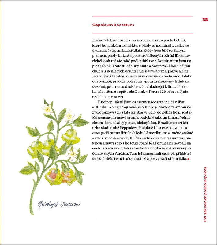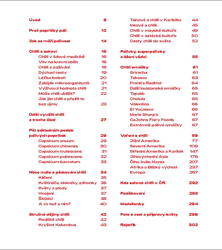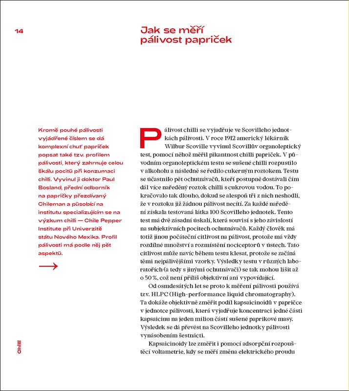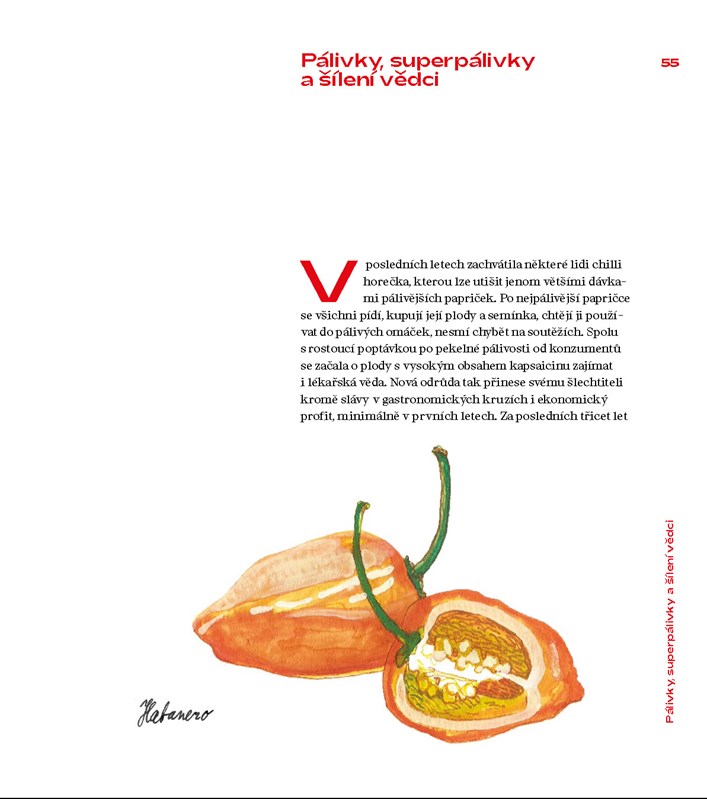 Jalapeno, habanero, Carolina Reaper, Louisiana Creeper – chilli papriček existuje mnoho odrůd a jsou oblíbené po celém světě. Kniha popisuje jejich cesty do jednotlivých regionálních kuchyní, podivné tvary a chuťové zvláštnosti plodů chilli, vysvětluje, co je to kapsaicin a jeho extrakt a jak se měří pálivost papriček. Kromě toho se čtenář dozví řadu kulturních zajímavostí, mytologických spojitostí i zcela praktických legend s chilli spojených – věděli jste třeba, že se používá proti divokým slonům?