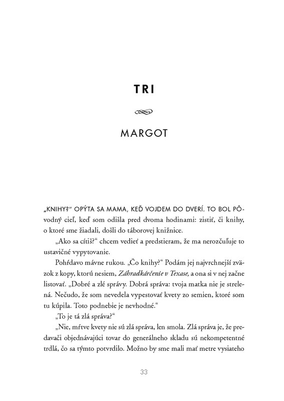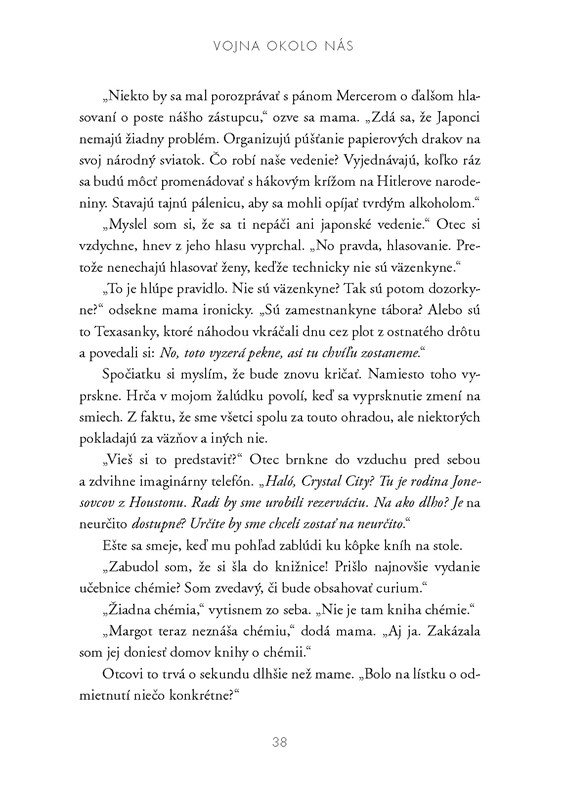 Táto kniha sleduje život dvoch dievčat v roku 1944, ktoré sa obe ocitli so svojimi rodinami v internačnom tábore Crystal City. Niektorí ľudia prišli o svoje domovy úplne, iní dúfajú, že sa budú môcť po vojne vrátiť. Podmienky v tábore síce neboli najhoršie, no žiť pod neustálym dohľadom ozbrojených strážcov, dodržiavať rôzne obmedzujúce pravidlá a každý deň znášať niekoľkohodinové sčítavanie - to musí byť naozaj hrozné. A na takýto život boli odsúdené aj Margot a Haruko.