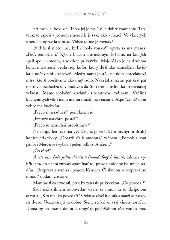 Veľmi som ocenila, že hoci sa počas celej knihy striedali pohľady oboch dievčat, rozprávanie bolo vždy napísané z pohľadu prvej osoby. Vedela som sa tak lepšie vcítiť do obidvoch postáv a spoznať ich myšlienky a vnútorné prežívanie. Zaujímavou vsuvkou bolo aj to, že pred niektorými kapitolami sa nachádzali krátke poznámky od Margot aj Haruko, ktoré niekedy komentovali, čo sa bude diať alebo ako dané udalosti prežívali. Najzaujímavejšie na tom bolo to, že vždy si ich názory protirečili a v podstate naznačovali, že sa blíži niečo zlé a že sa to čoskoro stane. To celý čas udržiavalo napätie a ja som bola ako na ihlách, keď som striehla na ten okamih. Až mi bolo ľúto, keď sa začali veci kaziť a ja som vedel, že príbeh čoskoro vyvrcholí. Priala by som si, aby bola kniha dlhšia alebo aby sa niektoré veci medzi postavami viac vyjasnili... pretože koniec ma vážne zasiahol a dúfala som v niečo iné. Príbehy však niekedy potrebujú aj také konce a knihe to len pridalo na reálnosti, takže v konečnom dôsledku sa nesťažujem, len ma niektoré veci mrzeli.