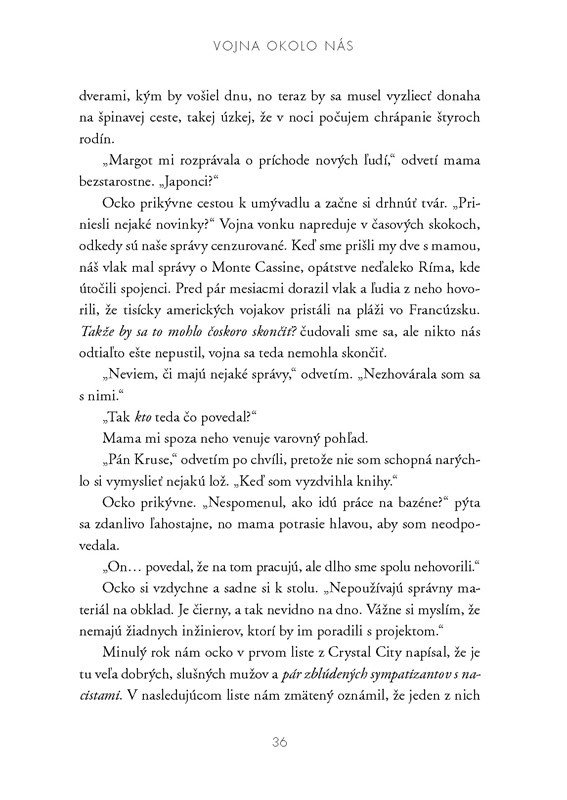 Rovnako ako Dievča v modrom plášti, aj táto kniha sa venuje vojnovej tématike, no odhaľuje stránku vojny, ktorú asi mnoho ľudí nepozná. Väčšina kníh o druhej svetovej vojne sa zameriava priamo na fronty alebo na utrpenie Židov. No táto opisuje osudy obyvateľov Ameriky, ktorí sa síce mohli ako Američania cítiť, no vláda na to mala iný názor. Ide o ľudí s inými koreňmi, s predkami v iných krajinách, konkrétne s nemeckými a japonskými. Voči Nemcom bolo určite veľa ľudí skeptických najmä kvôli Hitlerovi a ich odlišným stranám vo vojne. Samozrejme, že nie všetci boli nacisti, ale je ťažké nemať predsudky v čase vojny, keď sa všetci boja o svoj život a všetko vyzerá byť bezútešné. No to s tými Japoncami ma prekvapilo. Vôbec som nevedela, že Amerika takto zaobchádzala so svojimi občanmi tohto pôvodu. Vraj sa to vyostrilo po japonskom útoku na Pearl Harbor, keď sa vláda začala obávať ďalších útokov a tak veľa ľudí japonského pôvodu obviňovala zo špionáže.