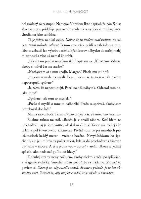 Margot bola úplne iná. Všetko chcela mať pod kontrolou, často bola nervózna a nad všetkým neustále premýšľala. Na jednu stranu bola veľmi racionálna a potláčala svoje emócie, no inokedy si nemohla pomôcť a konala len podľa nich. Podobne ako Haruko, aj ona sa v tábore ocitla po tom, čo najprv vzali jej otca a po nejakom čase za ním prišla aj ona s mamou. Zo všetkých síl sa snaží, aby bol ich život čo najnormálnejší a všemožne pomáha svojej mame, ktorá je tehotná. Musí však bojovať s predsudkami voči jej Nemeckému pôvodu, ktoré nezmizli ani za múrmi internačného tábora. A navyše, dievčatá musia skrývať aj svoje priateľstvo, pretože nemecká a japonská strana tábora sa snažia od seba držať čo najďalej a pre obe by to bolo príliš komplikované.