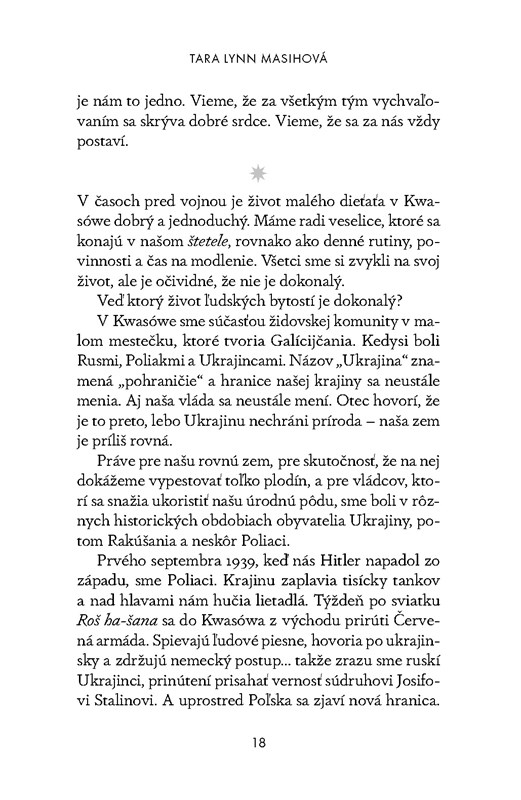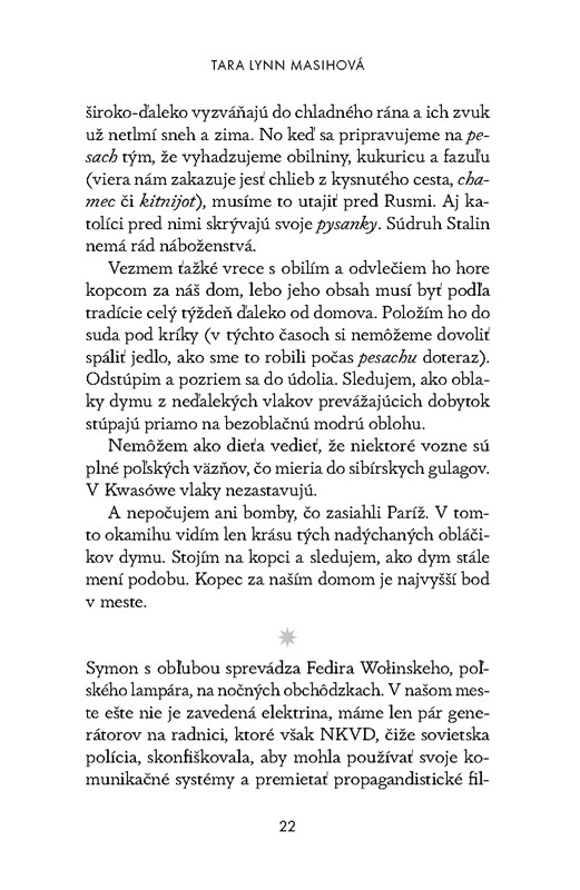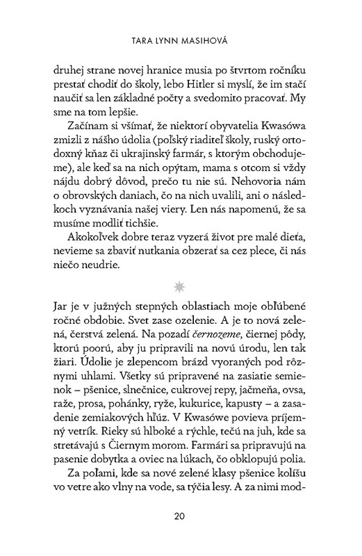 Tara Lynn Masihová ich však podáva s veľkým citom, veľkú úlohu v príbehu zohráva ľudskosť a ochota pomôcť. Text sa číta rýchlo, dej nie je rozvláčny či hutný, autorka sa vyhla zbytočným opisom a sústreďuje sa skôr na pocitovú stránku hlavnej postavy. Popritom nezabúda ani na plynulosť či chronológiu príbehu. Aj keď je to román o holokauste, autorka má ten výnimočný dar, že dokáže aj desivú minulosť presvietiť lúčmi slnka. Opisy prostredia a prírody malebného Kwasóva na vás zapôsobia svojou neopakovateľnou atmosférou.