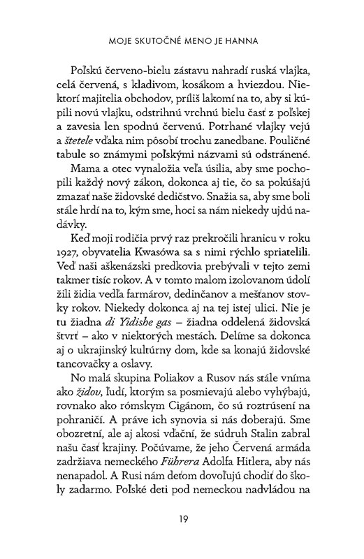 Moje skutočné meno je Hanna je príbeh, ktorý osloví čitateľov, ktorí prahnú po románoch z druhej svetovej vojny. Tara Lynn Masihová v svojom príbehu nazrela pod pokrievku jednej židovskej rodiny. Ústrednou postavou je štrnásťročná Hanna, ktorá sa stáva tichým pozorovateľom toho, ako sa jej život zo dňa na deň mení na peklo. S nepochopením sleduje, ako Nemci pustošia jej dedinu, ako zabíjajú nevinných ľudí. Obchody zívajú prázdnotou, miznú židovskí obchodníci, miestna polícia rozdáva kartičky s prídelmi aj na to málo jedla, čo je k dispozícií. Hanna vidí veci, ktoré vidieť nechce, no ak chce prežiť, nemá na výber.