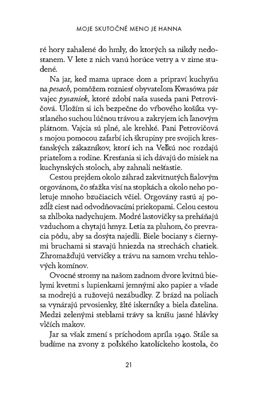 Moje skutočné meno je Hanna je emotívny a citlivý príbeh o obrovskej sile a vôli prežiť. Dramatický a dojímavý román o veľkom odhodlaní, nezištnej pomoci a spolupatričnosti rodiny.