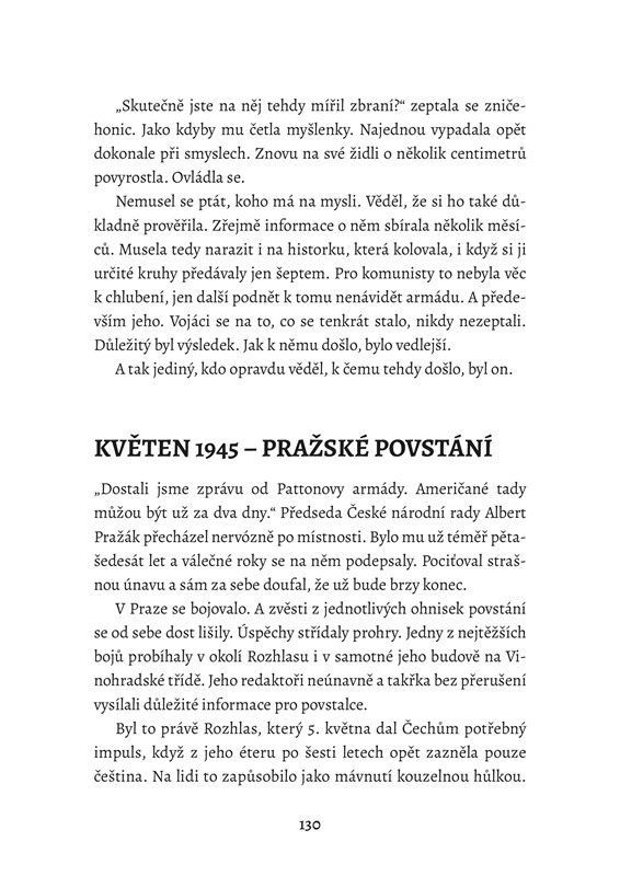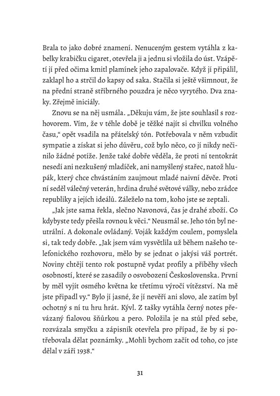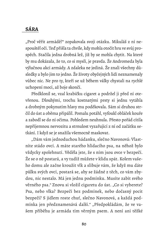 „Co všichni ti, které armáda nechala za sebou? Myslel na to vůbec někdo? Používali se civilisté jen jako obranné štíty? Nebo ještě něco horšího?“ Než stihl zareagovat, pokračovala dál: „Myslím, že víte, proč se na to ptám. Mocenské síly se rozdělily. Nikdo neví, co bude dál. Komu věřit. Lidé mizí a umírají každý den. Proč?“ Koutkem oka zachytila odraz v obrovském proskleném okně po své levici. Na okamžik si byla jistá, že zahlédla Samovu tvář. Ne, okřikla sama sebe v duchu. On musí ještě počkat.