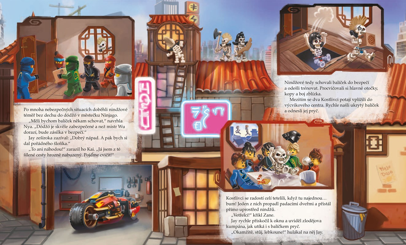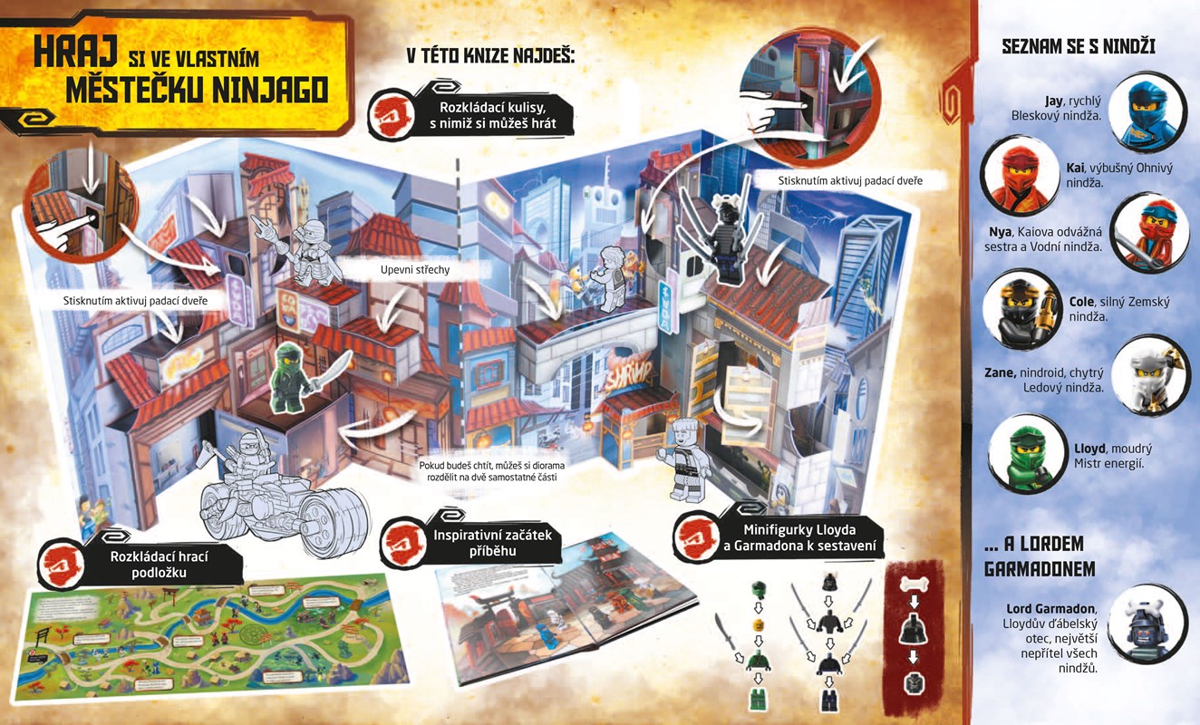 Městečko Ninjago je plné překvapení, která čekají na udatné nindže i jejich protivníky. Jaké dobrodružství prožijí příště? To je jen na tobě! Tato kniha ti sice nabídne začátek příběhu, jeho konec však vymyslíš ty. A bude to parádní jízda – můžeš si ho totiž sehrát na rozkládací podložce nebo v 3D kulisách, které v knize najdeš společně se dvěma minifigurkami. V pokojíčku ti tak vyroste třírozměrný svět Ninjago a ty se budeš moci ponořit do příběhů udatných nindžů hlouběji než kdy předtím.