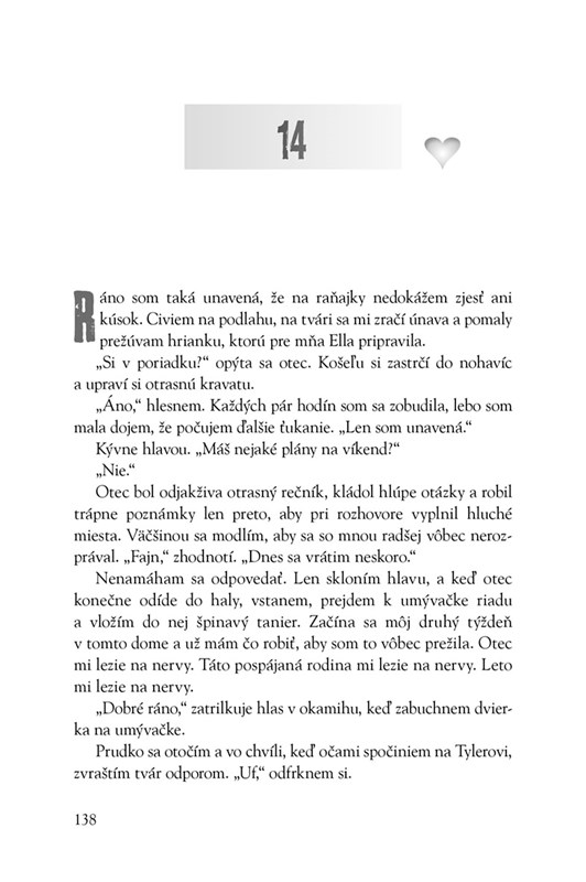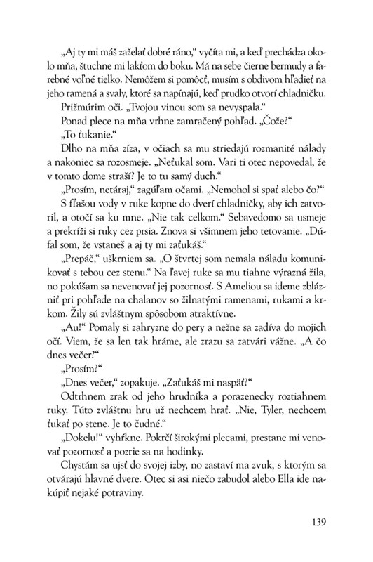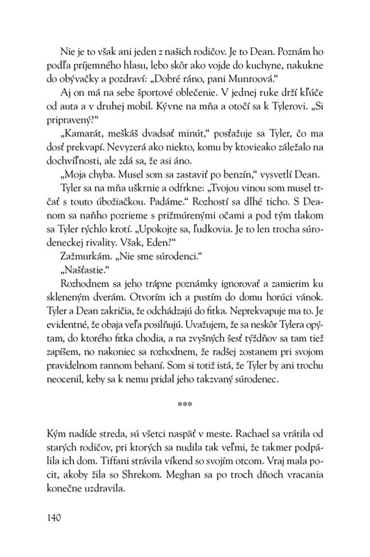 Obálka knihy pôsobí ako obal DVD, čo však nevadí ani to nie je celkom mimo. Text je totiž dynamický a odvíja sa rýchlo ako prestrihy na filmovom plátne. Postavy si vás okamžite získajú, a to aj napriek tomu, že nemusia hneď na prvý pohľad vyzerať sympaticky. To sa týka hlavne Tylera. Spočiatku sa zdá, že pôjde o typické klišé o rozmaznanom, večierkami a dievčatami zhýčkanom mladíkovi, no postupne odhaľuje svoje skryté stránky, vďaka čomu sa z neho stane hrdina, ako sa patrí. Jeho vzťah s Eden je prakticky už vopred poznamenaný nechuťou, keďže ich rodičia (Edenin otec a Tylerova matka) sa vzali a odrazu z nich má byť veľká (milujúca?) rodina. Eden však spoznáva nových súrodencov až po troch rokoch, počas ktorých si vytvorila o nových bratov rôzne obrazy. Tylerovo sebavedomie ju neskutočne irituje, ale nemá šancu vyhnúť sa mu. Aj preto s ním trávi čoraz viac času a hoci si je vedomá nebezpečenstva jeho príťažlivosti, nemá dosť síl odolať zakázanej vášni...