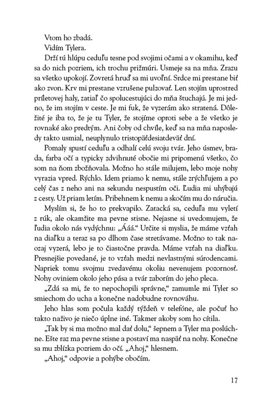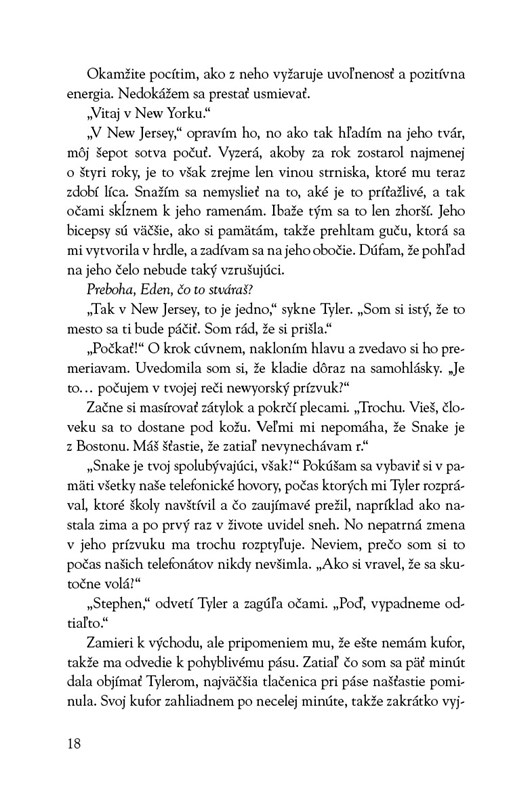 V príbehu sme sa posunuli o rok dopredu. Eden je vo vzťahu s Deanom, Tylerovým kamarátom a Tyler odišiel hľadať šťastnú budúcnosť do New Yorku. Eden a Tyler sa nevideli rok a teraz majú spolu stráviť istý čas, čo môže byť veľmi zaujímavé, ale zároveň pre nich aj ťažké. Bola som zvedavá, ako na seba budú reagovať a myslím, že to autorka vykreslila úplne perfektne. Zo začiatku bolo cítiť to napätie, trápnosť, ako keď sa s niekým dlho nevidíte. Postupne už sa začali ľady lámať. Musím sa však priznať, že som sa v tomto dieli s Eden nevedela nejako stotožniť. Mala som pocit, že sa stále na niečo iba sťažuje, že jej všetko vadí, že pre ňu nič nie je dobré a dostačujúce a po určitom čase mi to už začalo aj trošku prekážať. Našťastie Tyler bol stále tým perfektným drsným chlapcom, ktorý dokázal zo seba urobiť aj poriadne zlatíčko a roztopiť tak všetkým srdiečka. Páčilo sa mi, že Estelle viac zapojila aj vedľajšie postavy a vytvorila tak komplexný príbeh, v ktorom sa stále niečo dialo. Aj napriek tomu, že na prvý pohľad to môže vyzerať tak, že je príbeh len jedno veľké klišé, v skutočnosti to tak vôbec nie je. Autorka síce pracuje s pomerne ošúchanou témou zakázanej lásky medzi nevlastnými súrodencami, ale dokázala z nej urobiť oveľa viac, ako by sa na prvý pohľad mohlo zdať. Opäť do príbehu zakomponovala aj dôležité životné otázky, rozhodnutia a filozofické úvahy, ktoré aj vás nepriamo donútia, aby ste sa zamysleli nad vlastným životom. Páčilo sa mi, že som sa v príbehu niekedy ako keby našla a dokázala uplatniť isté situácie aj na svoj reálny život. Mám potom pocit, ako keby som bola priamo súčasťou príbehu a nie len jeho nestranným pozorovateľom.