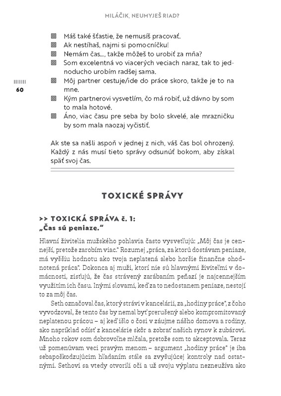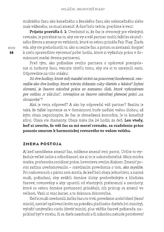 Výsledkom jej práce je kniha Miláčik, neumyješ riad?, v ktorej vám predstavuje systém šetriaci váš drahocenný čas a nervy, pretože párom ponúka úplne nový spôsob rozdelenia práce a zodpovednosti. Štyri ľahko dodržiavateľné pravidlá, 100 kariet s úlohami v domácnosti a tipy ako začať konverzovať o zmene s partnerom vám pomôžu stanoviť si priority, ktoré sú dôležité pre vašu rodinu, a tiež dohodnúť sa a strategicky si rozdeliť domáce práce tak, aby bola pokrytá každá jedna povinnosť od prania, cez domáce úlohy až po prípravu večere.