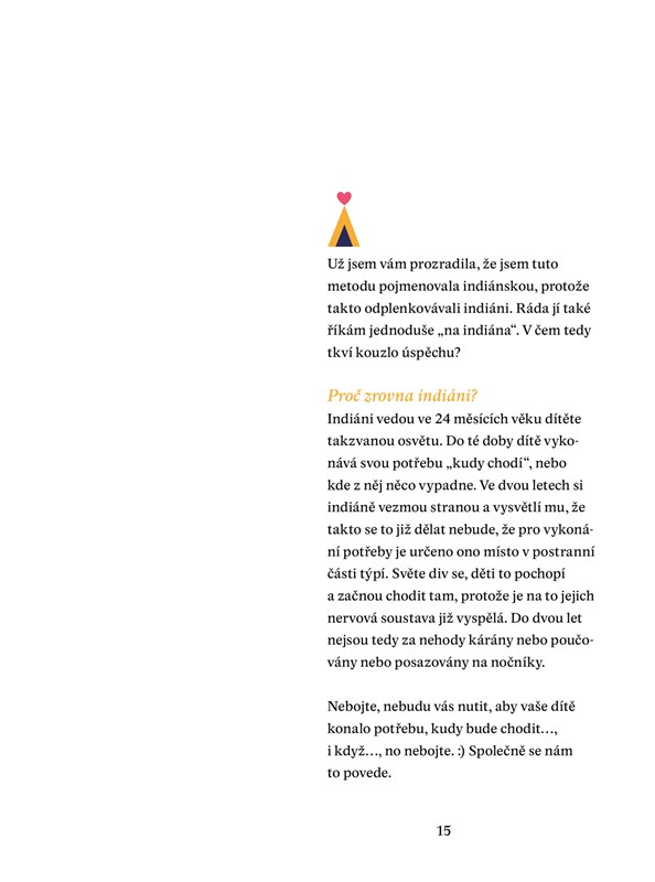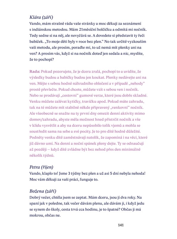 „Kdysi jsem se dozvěděla o indiánech a jejich způsobu „odplenkování“. A celá ta plenkohitparáda se mi propojila. Neustálé hlídání, zda se dítěti zrovna nechce, opakované vysazování na nočník, používání nočníku, který zahraje, když do něj spadne „výtvor“... a další opravdu fajn věcičky a triky, které ale fungují teprve tehdy, až je dítě na odplenkování zralé. Což bývá u každého dítěte jinak, a proto je potřeba k celé situaci přistupovat individuálně.