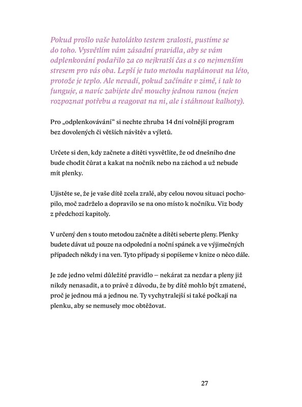 Jak poznat, že je vaše dítě zralé na odplenkování, a jak potom na to? To vše naleznete v této knize, kterou nejlépe popisuje sama autorka: