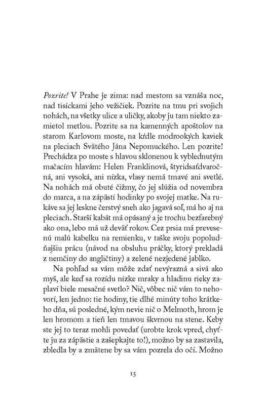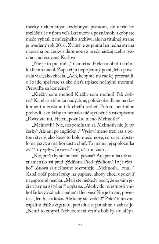 Melmoth je stará legenda, ktorou sa strašia malé deti, ale čo ak je predsa len skutočná? Čo potom? Všetci by si dvakrát rozmysleli, či chcú páchať zlo, a tí, ktorí sa ešte nestali hriešnikmi, by urobili všetko pre to, aby nimi ani nikdy neboli. To, čo vykonáš, sa ti vráti, no málokto na to myslí. Dôsledky činov sú stále prítomné. Ale keby to vedela aj Helen. Prenasleduje ju temné tajomstvo. Je pre Melmoth ako stvorená.
