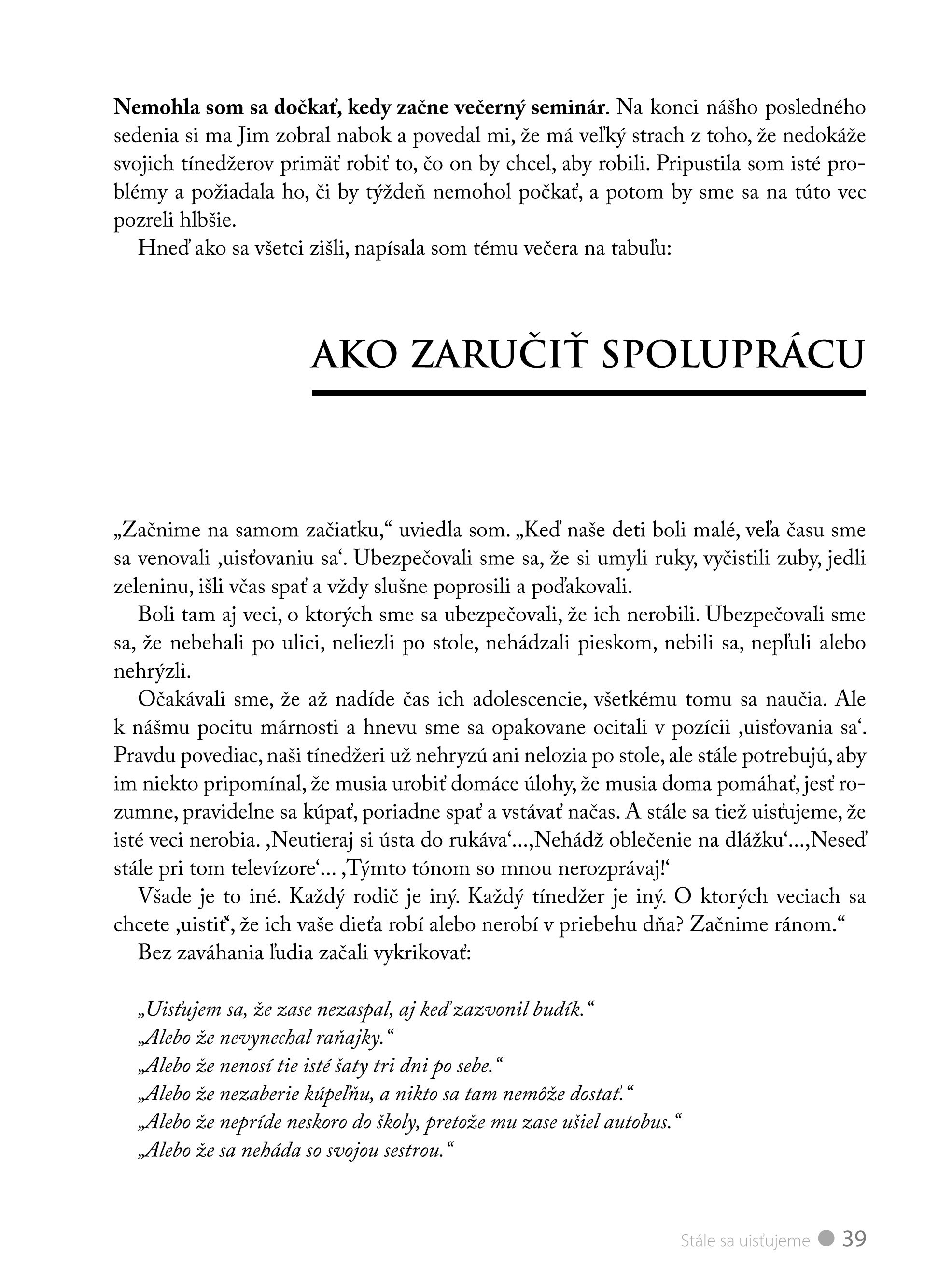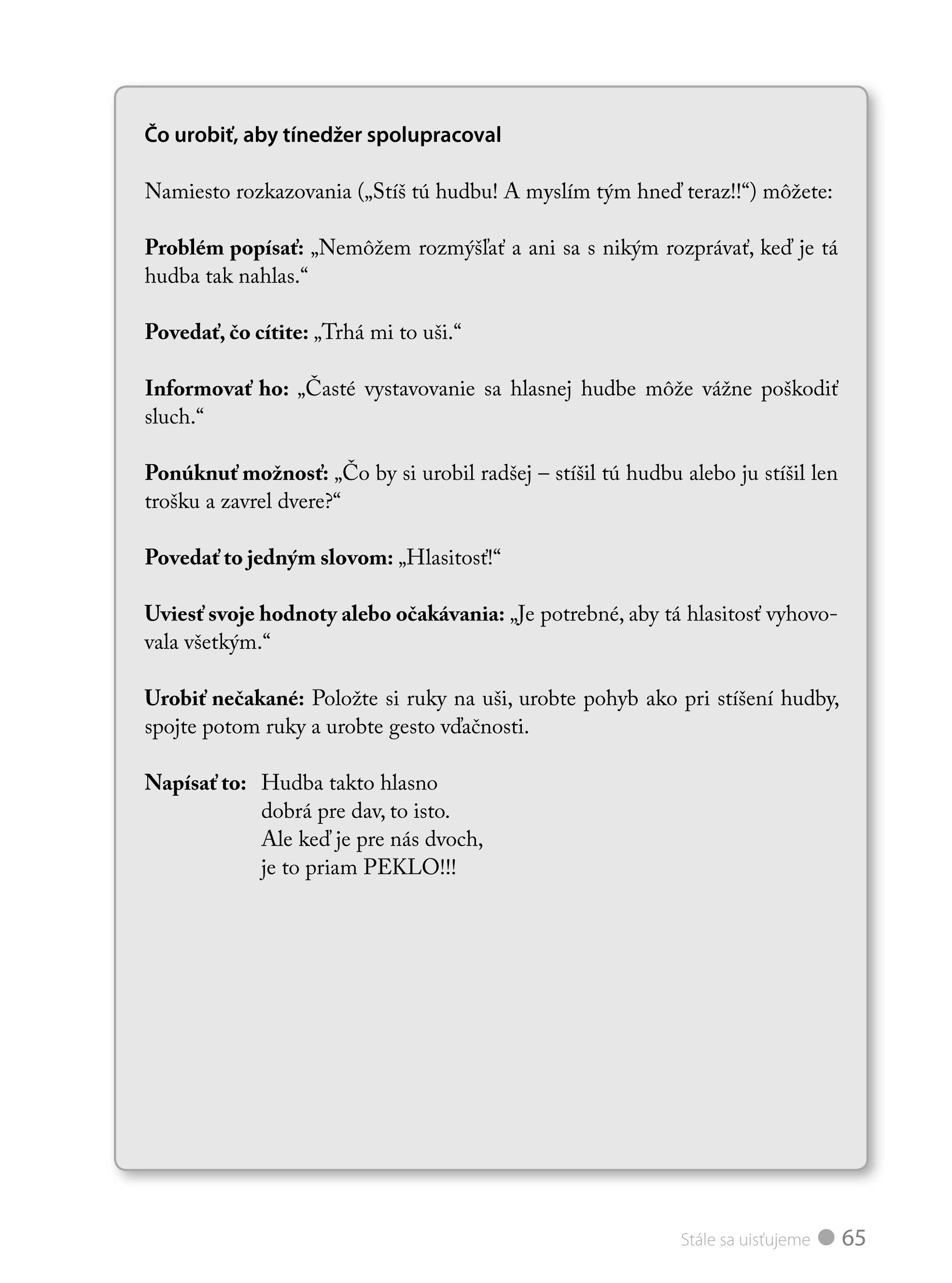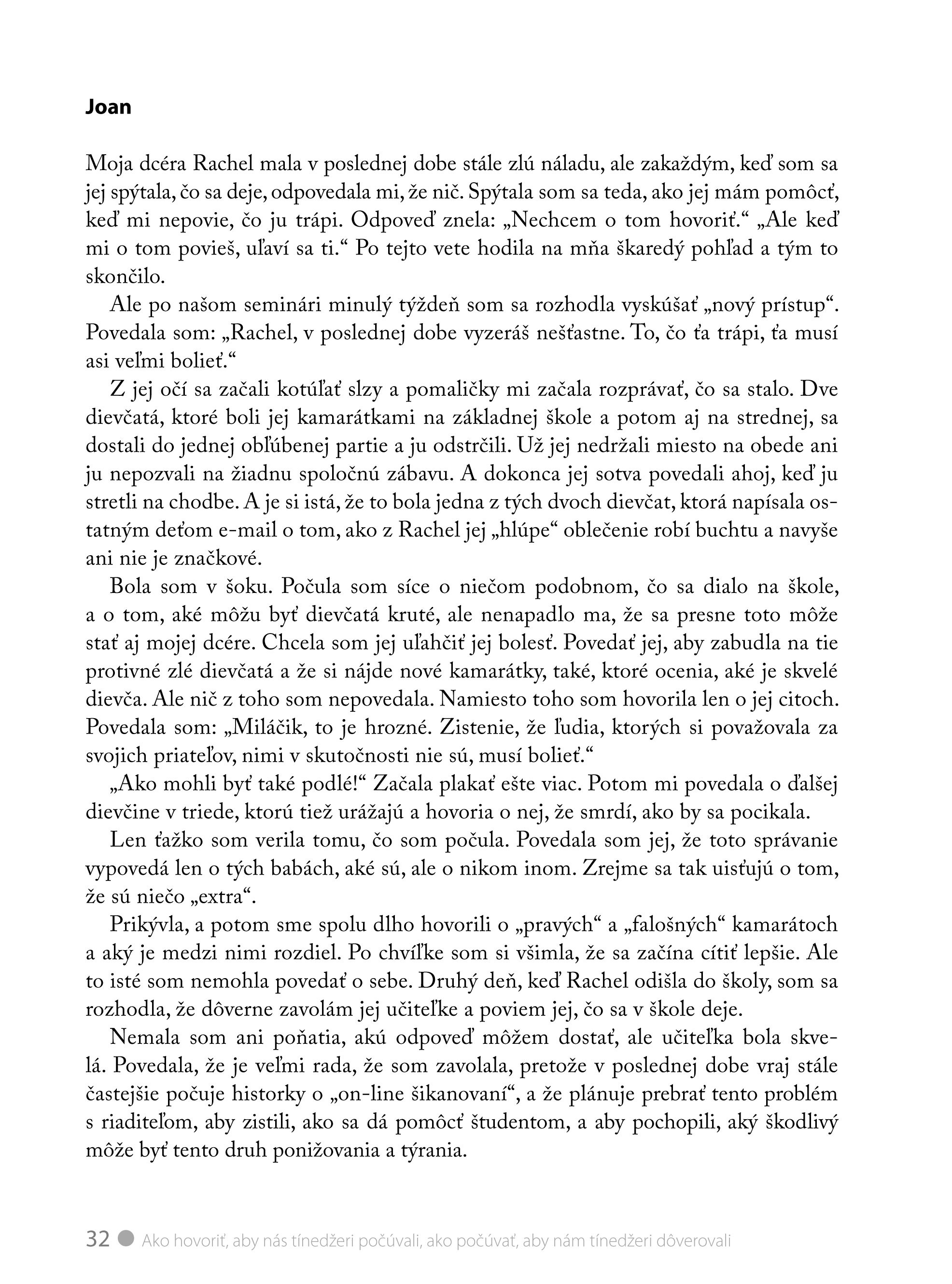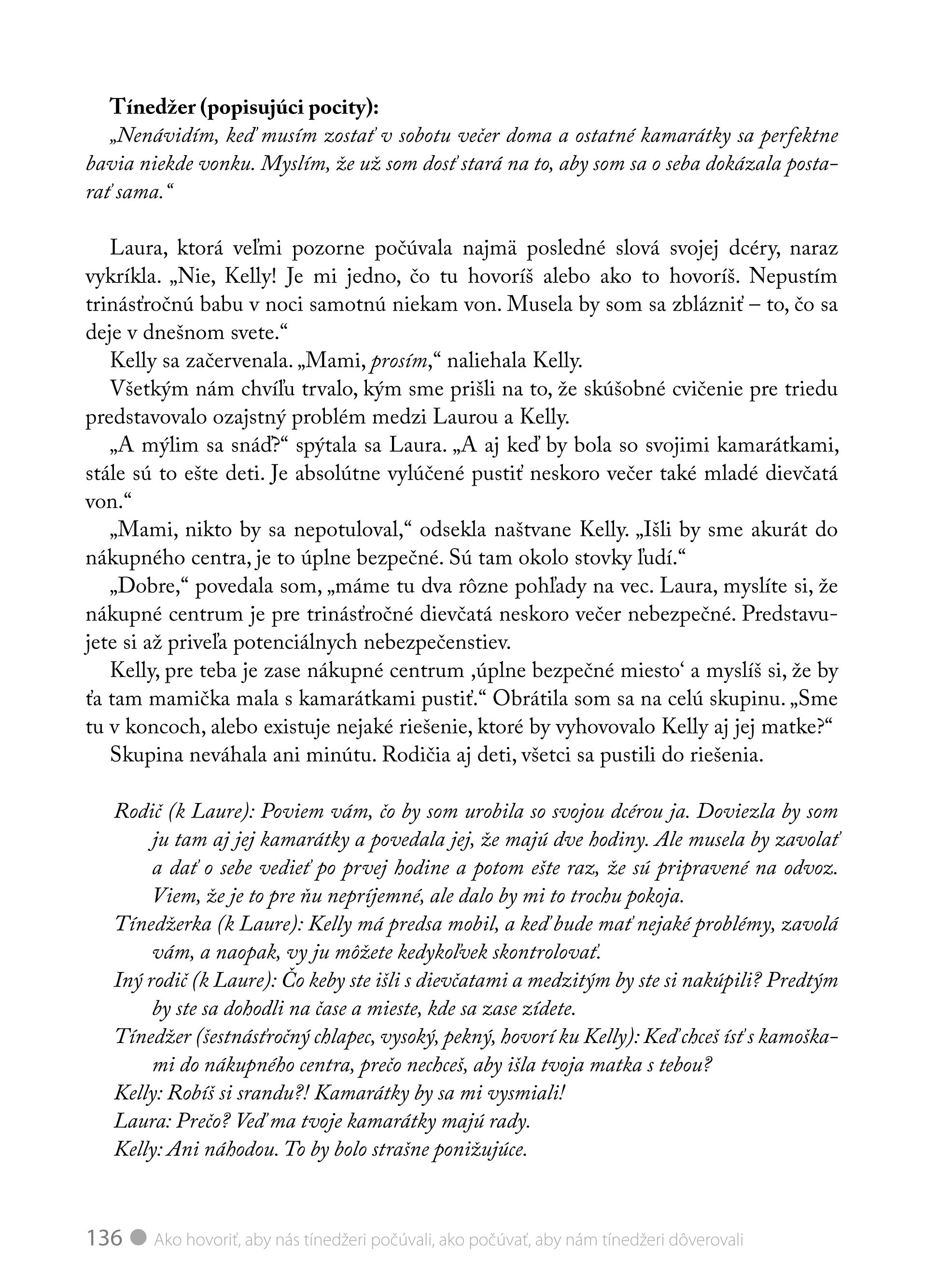 Máte doma pubertiaka a rozumiete si s ním čím ďalej menej? Táto kniha je skvelým radcom, ako komunikovať s dospievajúcimi tak, aby naše slová brali vážne a ako ich počúvať, aby v nás dospelých videli partnera a nie nepriateľa. Spôsoby konania a tipy, ako viesť dialóg, sú veľmi názorne predvedené na kreslených scénkach. Autorky využívajú príklady zo života a rozhovorov medzi rodičmi a ich deťmi. Na problémoch iných rodín si lepšie uvedomíte, kde sa dopúšťate chýb a poučíte sa, ako niektoré zabehnuté spôsoby správania zmeniť.
