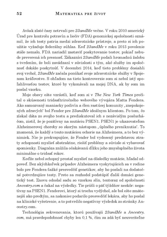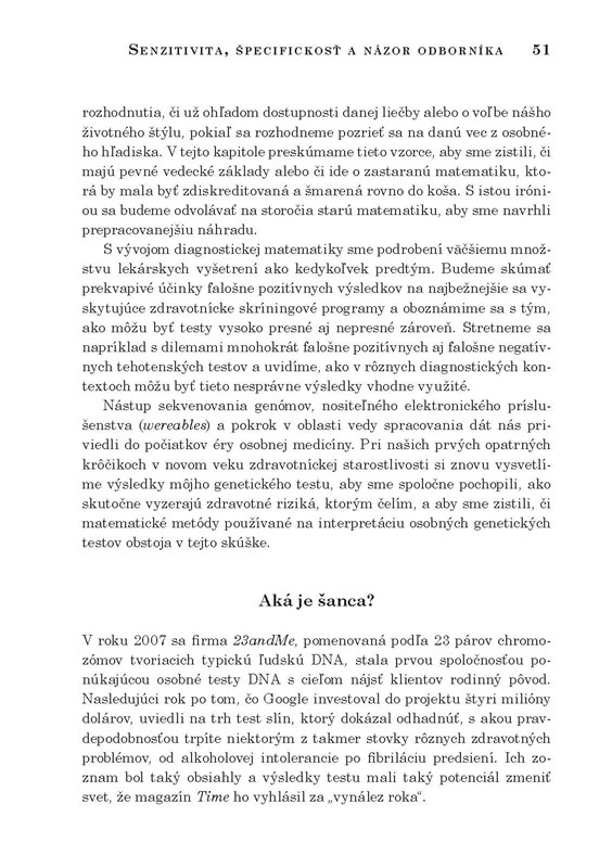 Kniha sa opiera o prĂbehy skutoÄŤnĂ˝ch udalostĂ, vÄŹaka ktorĂ˝m zistĂte, ako nájsĹĄ najlepšie miesto vo vlaku a najrĂ˝chlejšà frontu u zeleninára, ako sa upokojiĹĄ tvárou v tvár neÄŤakanej lekárskej diagnĂłze, ako sa pouÄŤiĹĄ z ÄŤernobyÄľskej katastrofy aj ako zastaviĹĄ smrtiacu epidĂ©miu. Spoznáte prĂbehy justiÄŤnĂ˝ch omylov, ale aj investorov, ktorĂ prišli o bohatstvo. OdhalĂte, ako nám matematika mĂ´Ĺľe zmeniĹĄ Ĺľivot k lepšiemu, ako sa vyvarovaĹĄ omylov alebo ako ÄŤĂtaĹĄ správy a odhaÄľovaĹĄ lĹľi. Matematika je všade okolo nás, staÄŤĂ sa len nauÄŤiĹĄ inak premýšľaĹĄ.