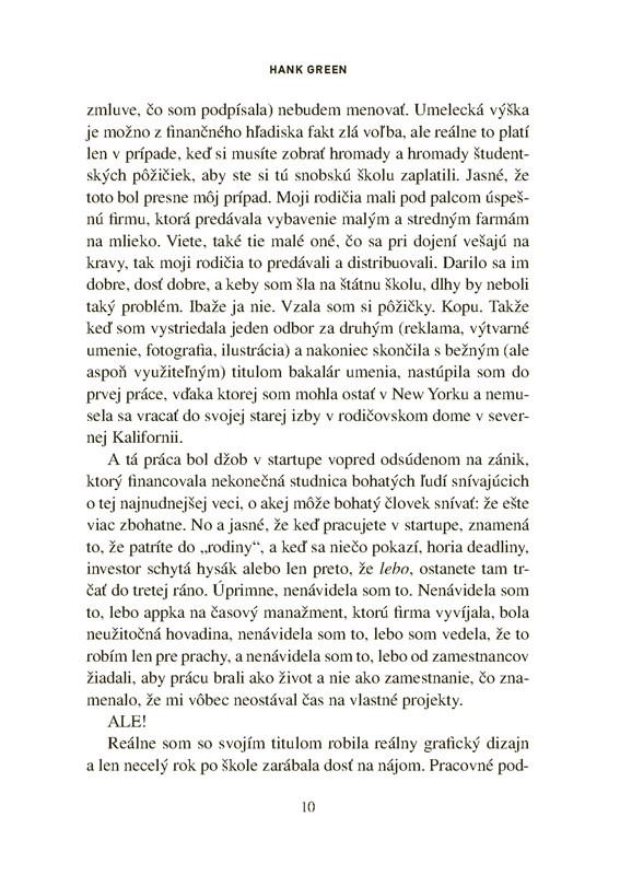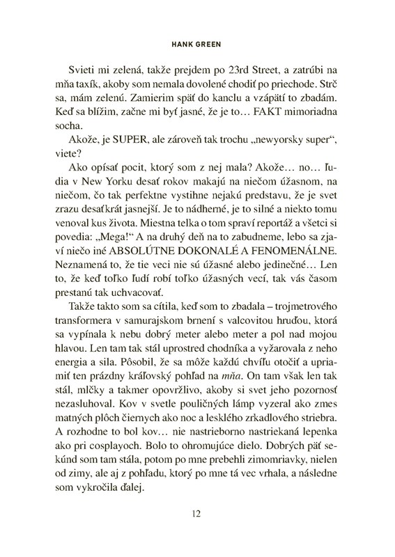 Ono totiž téma Carlov a hľadania odpovedí na otázky o ich pôvode a význame je skôr ako kulisa celej knihy. Preto som pri čítaní mala neustále pocit, akoby som v rukách držala knihu od Patricka Nessa, nakoľko aj Hank Green mal tendenciu spájať niekoľko žánrov a tiež mal pocit, že by ma mal vedome zavádzať, ale takisto ma nútil premýšľať a potom tu boli tie nekonečné metafory... Skrátka, nessovka ako vyšitá. Dej teda nebol najdôležitejší, oveľa väčšiu úlohu tu zohrávali práve tie časti, v ktorých som sa mala zamyslieť, najmä nad správaním ľudí a nad ich reakciami na rôzne situácie, hlavne nad ich strachom a k čomu všetkému ich dokáže dohnať.